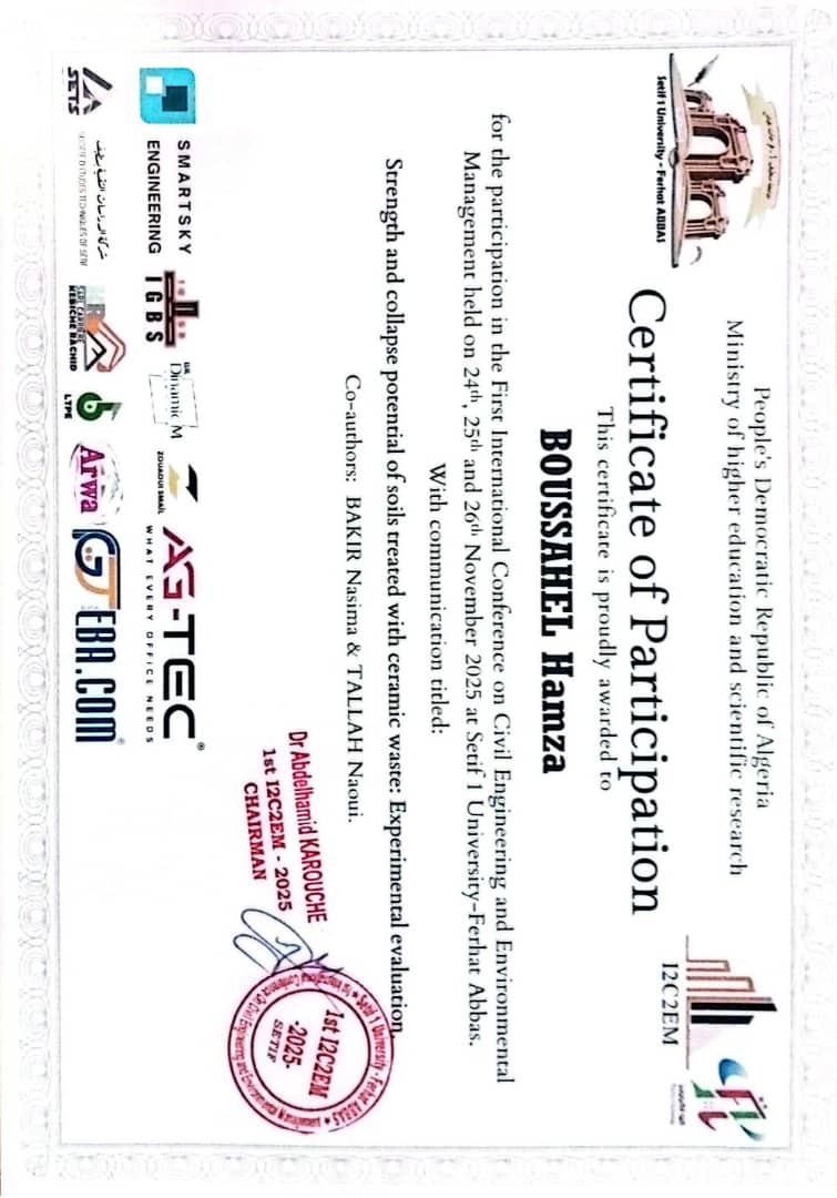 M. BAKIR Nassima, (2025-11-24), "Strength and collapse potentiel of soils treated with ceramic waste: Experimental evaluatio.", [international] the first international conference on civil engineering and environmental management . , Sétif, Algérie