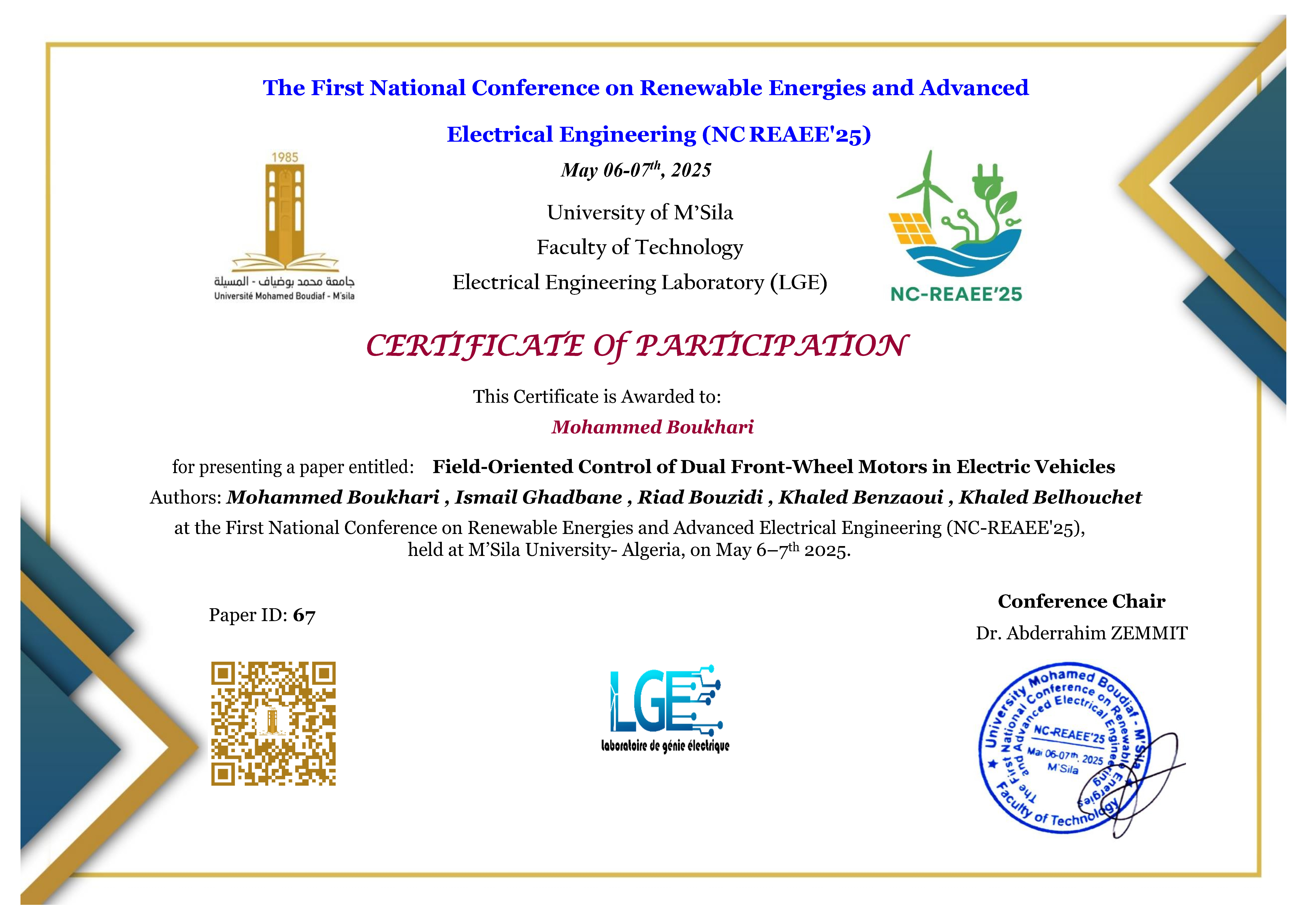 M. BOUZIDI Riad, (2025-12-10), "Independent FOC control of dual front induction motor considering differential wheel speeds in electrical vehicles", [international] The 2nd International Conference on Advanced Technology in Electronic and Electrical Engineering – ICATEEE 2025 , M'SILA