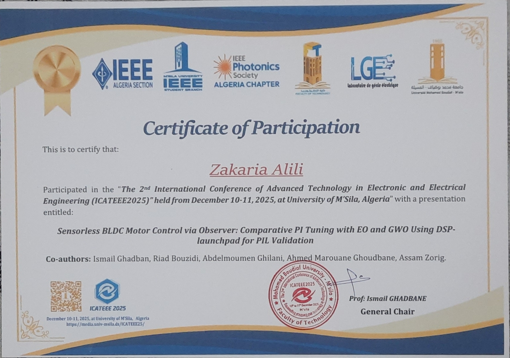 M. BOUZIDI Riad, (2025-12-10), "The 2nd International Conference on Advanced Technology in Electronic and Electrical Engineering – ICATEEE 2025", [international] Sensorless BLDC Motor Control via Observer: Comparative PI Tuning with EO vs GWO and Using DSP-launchpad for PIL Validation , M'SILA University