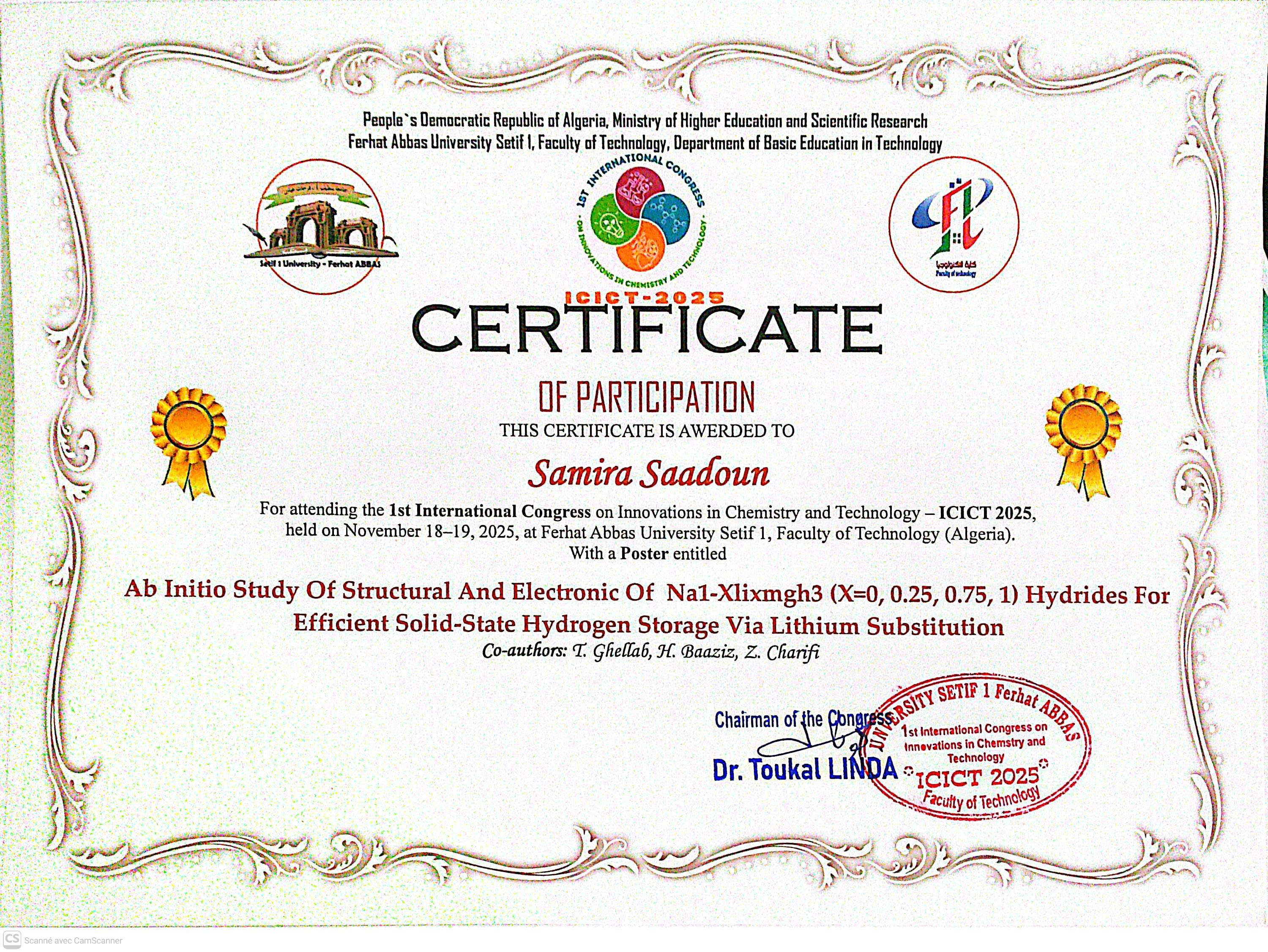 M. GHELLAB Torkia, (2025-12-14), "First principles investigation of the structural and electronic properties of Na1-xLixMgH₃ hydrides for enhanced solid-state hydrogen storage", [international] 1st-ICCP 2025 , Constantine 1 University – frères Mentouri.