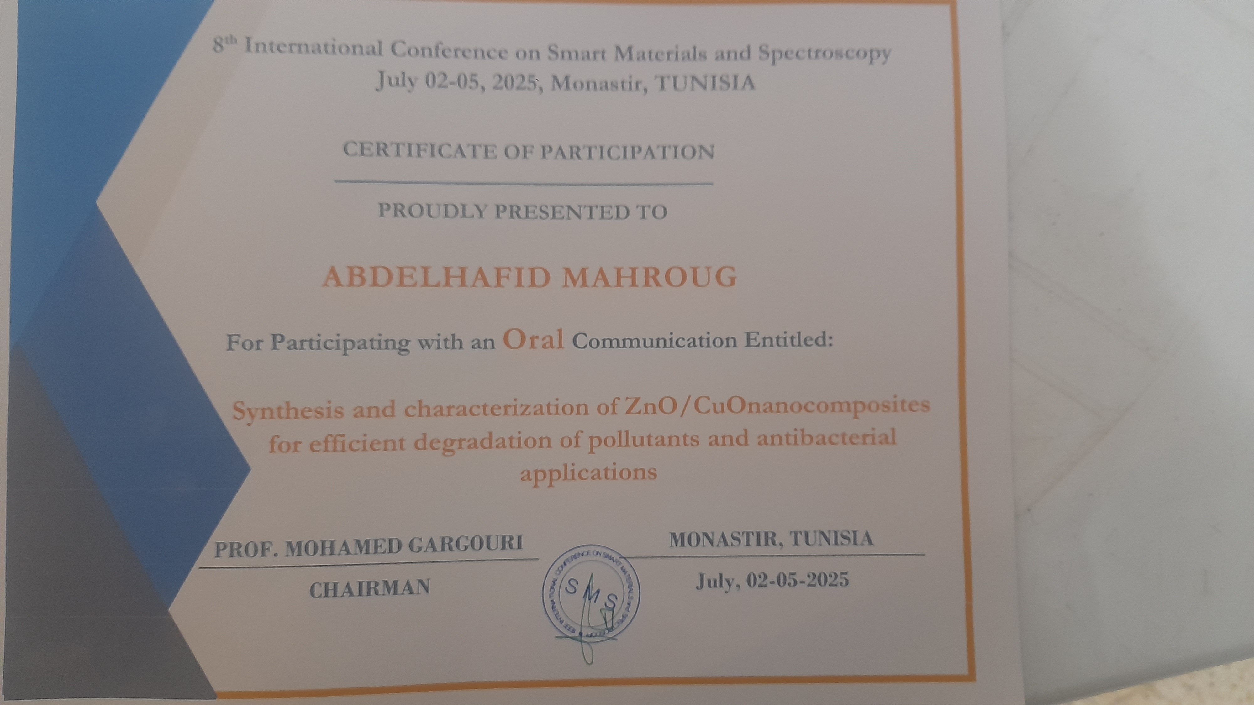 M. MAHROUG Abdelhafid, (2025-07-02), "Synthesis and characterization of ZnO/CuO nanocomposites for efficient degradation of pollutants and antibacterial applications.", [international] 8th international conference on smart materials and spectroscopy sms 2025 , monastir TUNISIA