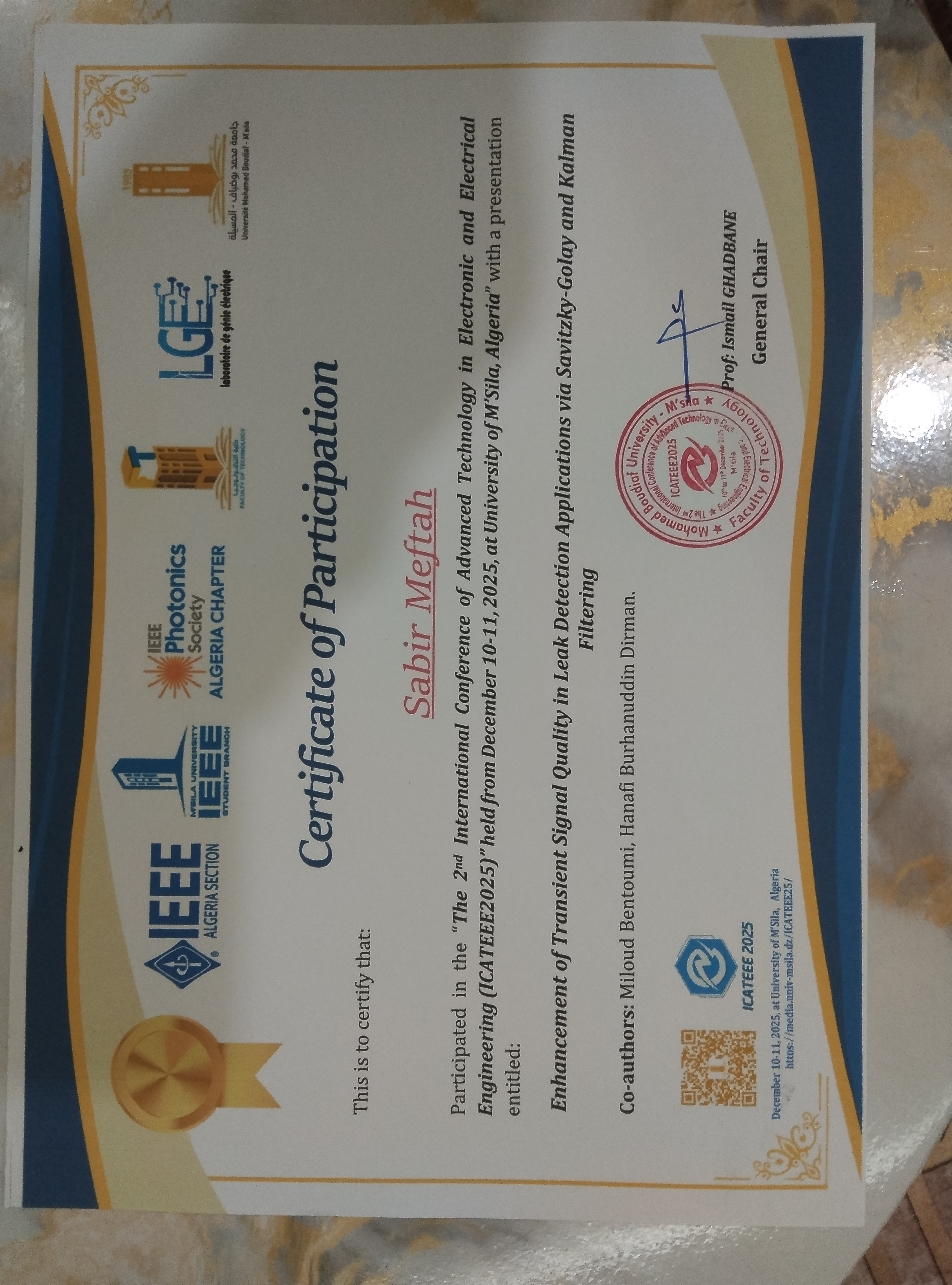M. BENTOUMI Miloud, (2025-12-10), "Enhancement of Transient Signal Quality in Leak Detection Applications via Savitzky-Golay and Kalman Filtering", [international] ICATEEE2025 , M'sila