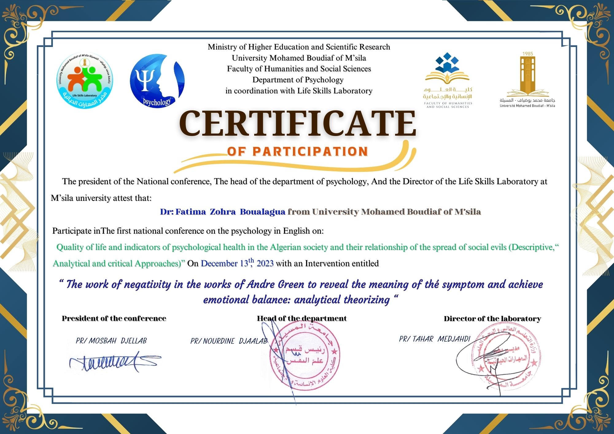 M. BOUALAGUA Fatima zohra, (2024-12-12), "the work of negativity in the works of ANDRE GREEN to reveal the meaning of the symptom and achieve emotional balance: analytical theorizing", [national] conference on the psychology in English on quality of life and indicators of psychological health in the Algerian society and their relationship of spread of social evils , M'sila university