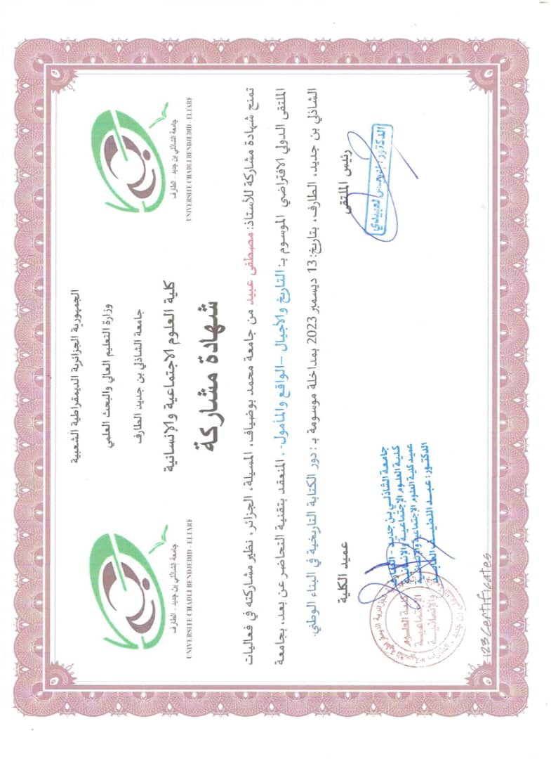 M. ABID Mostefa, (2023-12-13), "دور الكتابة التاريخية في البناء الوطني", [international] التاريخ والأجيال: الواقع والمأمول , جامعة الشاذلي بن جديد الطارف