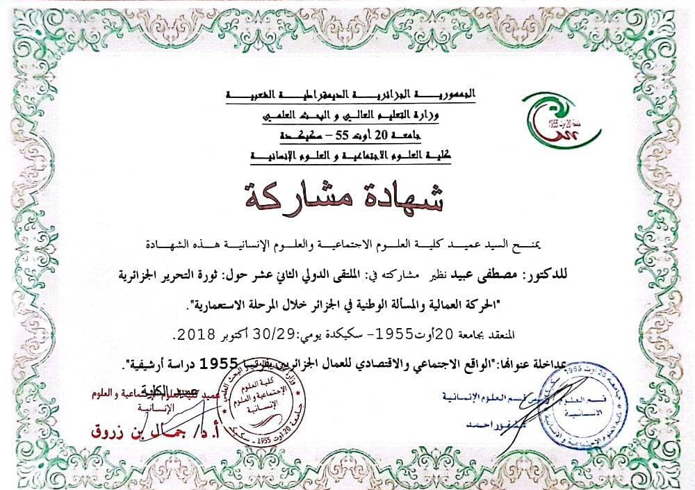 M. ABID Mostefa, (2018-10-29), "الواقع الاجتماعي والاقتصادي للعمال الجزائريين بفرنسا 1955 دراسة أريشفية", [international] الملتقى الدولي الثاني عشر حول: ثورة التحرير الجزائرية "الحركة العمالية والمسألة الوطنية في الجزائر خلال الفترة الاستعمارية" , جامعة 20 أوت 1955 بسكيكدة