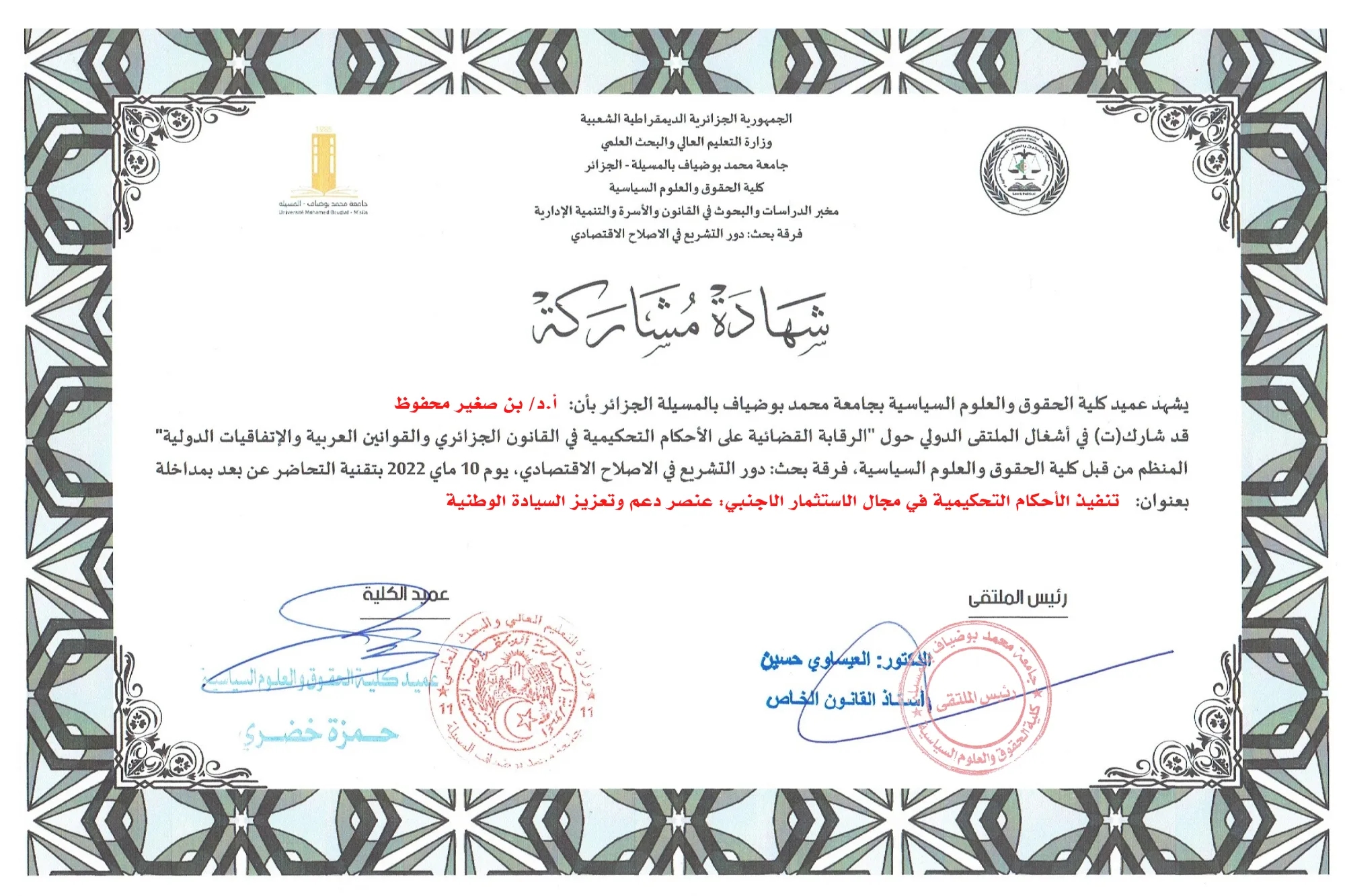 M. MAHFOUD Benseghir, (2022), "تنفيذ الأحكام التحكيمية في مجال الاستثمار الأجنبي عنصر دعم وتعزيز للسيادة الوطنية", [international] الرقابة القضائية على الأحكام التحكيمية في القانون الجزائري والقوانين العربية والاتفاقيات الدولية , جامعة المسيلة