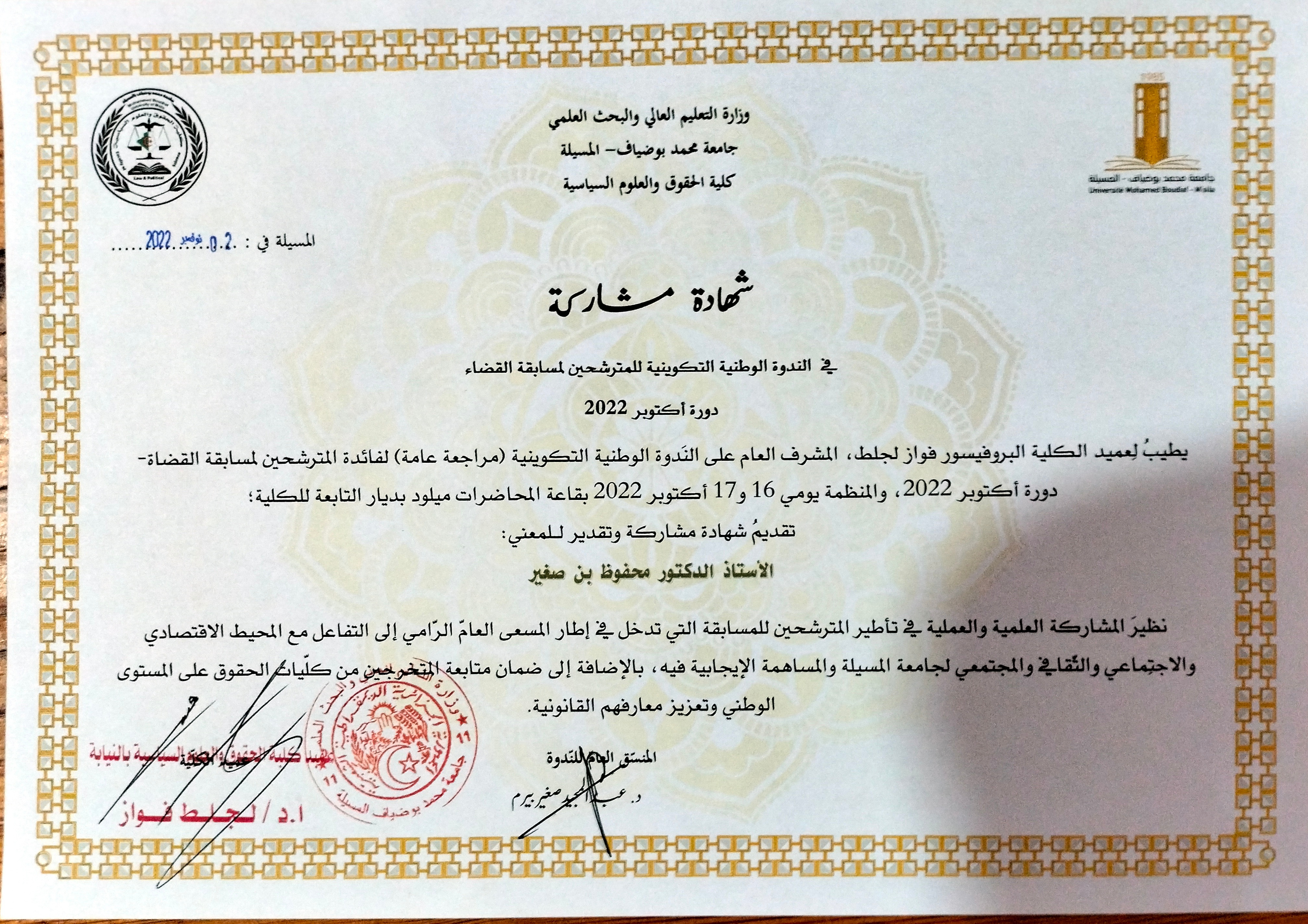 M. MAHFOUD Benseghir, (2022), "النظام القضائي في الجزائر", [national] الندوة الوطنية التكوينية للمترشحين لمسابقة القضاء , جامعة المسيلة