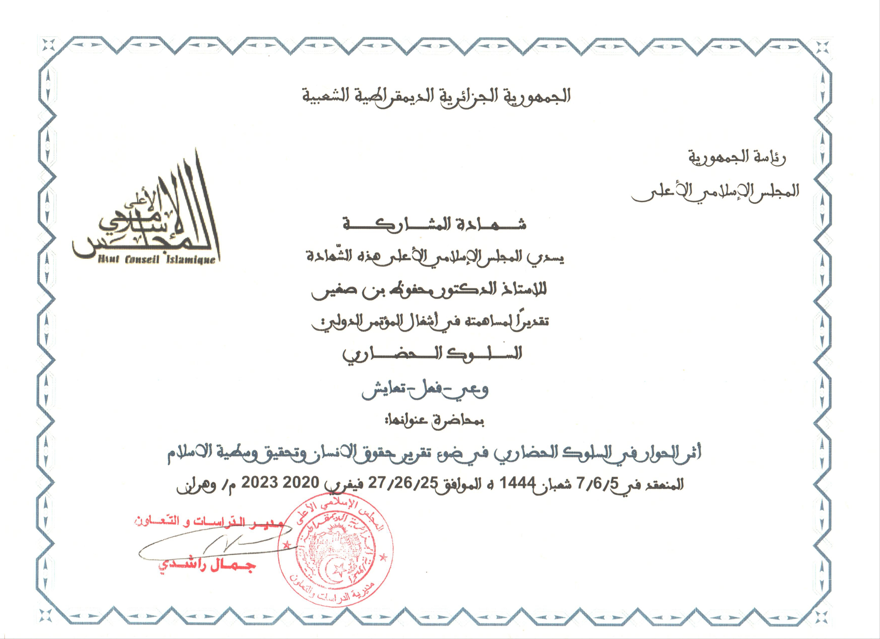 M. MAHFOUD Benseghir, (2023), "أثر الحوار في السلوك الحضاري في ضوء حقوق الإنسان وتحقيق وسطية الإسلام", [international] السلوك الحضاري , المجلس الإسلامي الأعلى