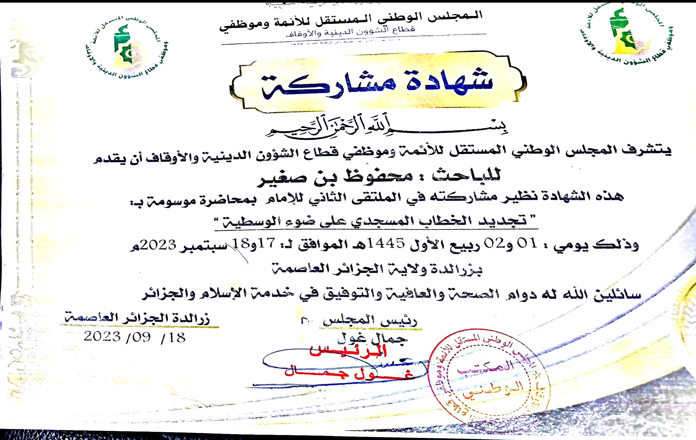 M. MAHFOUD Benseghir, (2023-09-17), "تجديد الخطاب المسحدي على ضوء الوسطية", [national] الملتقى الثاني للإمام , الجزائر