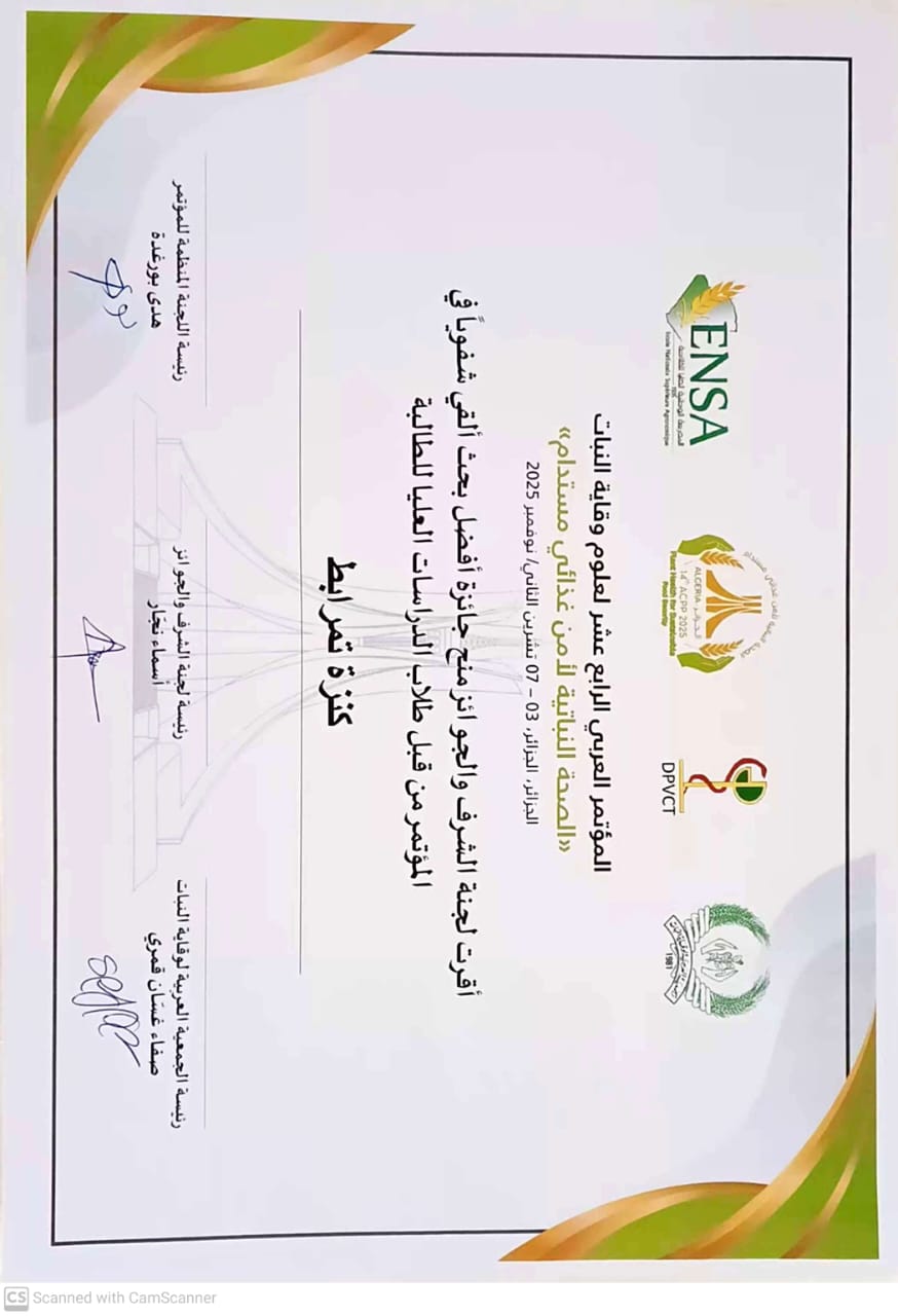M. BARECH Ghania, (2025-07-11), "افضل بحث القي شفويا في المؤتمر الدولي العربي الرابع عشر لعلوم وقاية النباتات الصحة النباتية لامن غذائي مستدام", [national] ENSA El Harrach