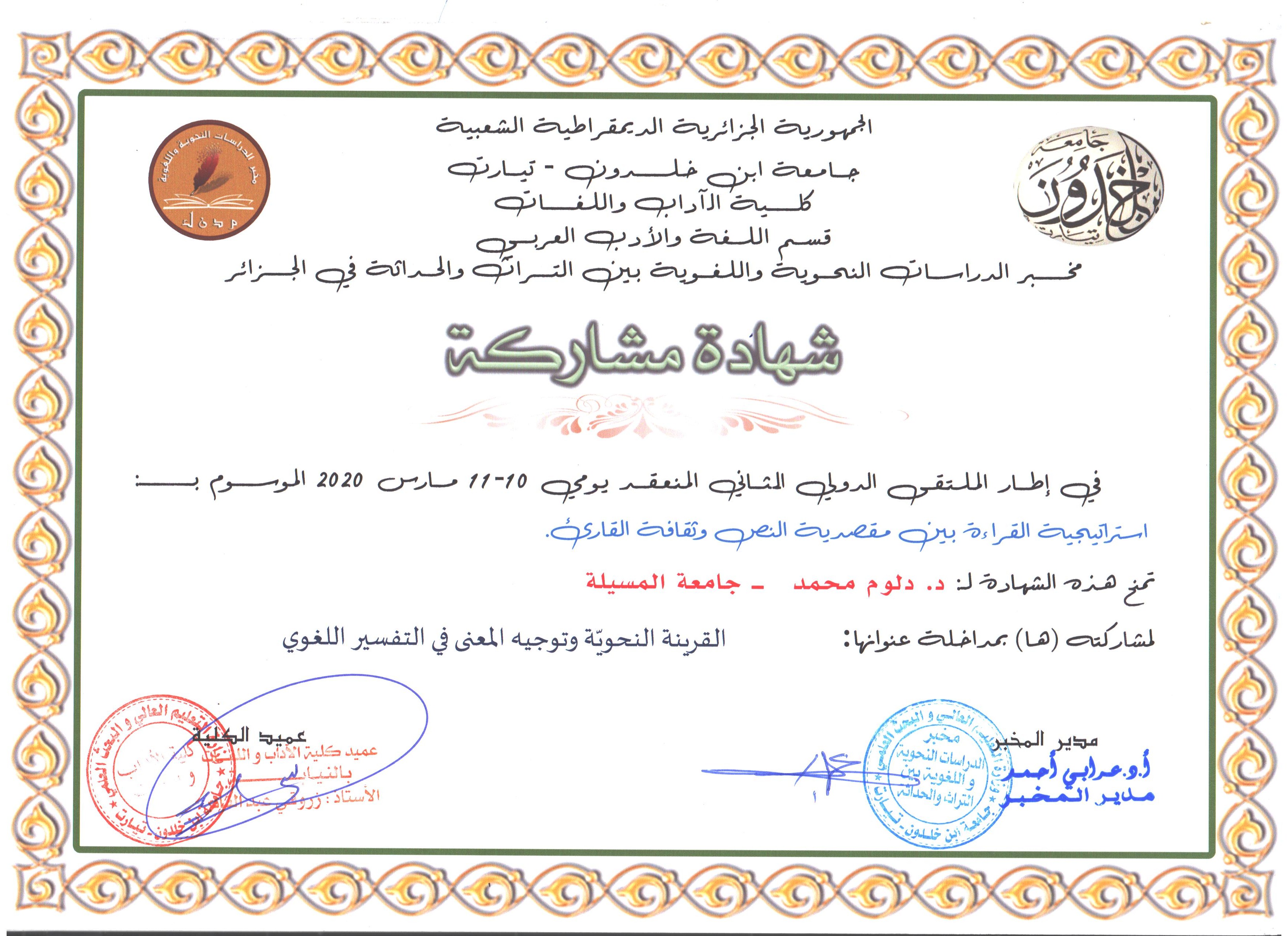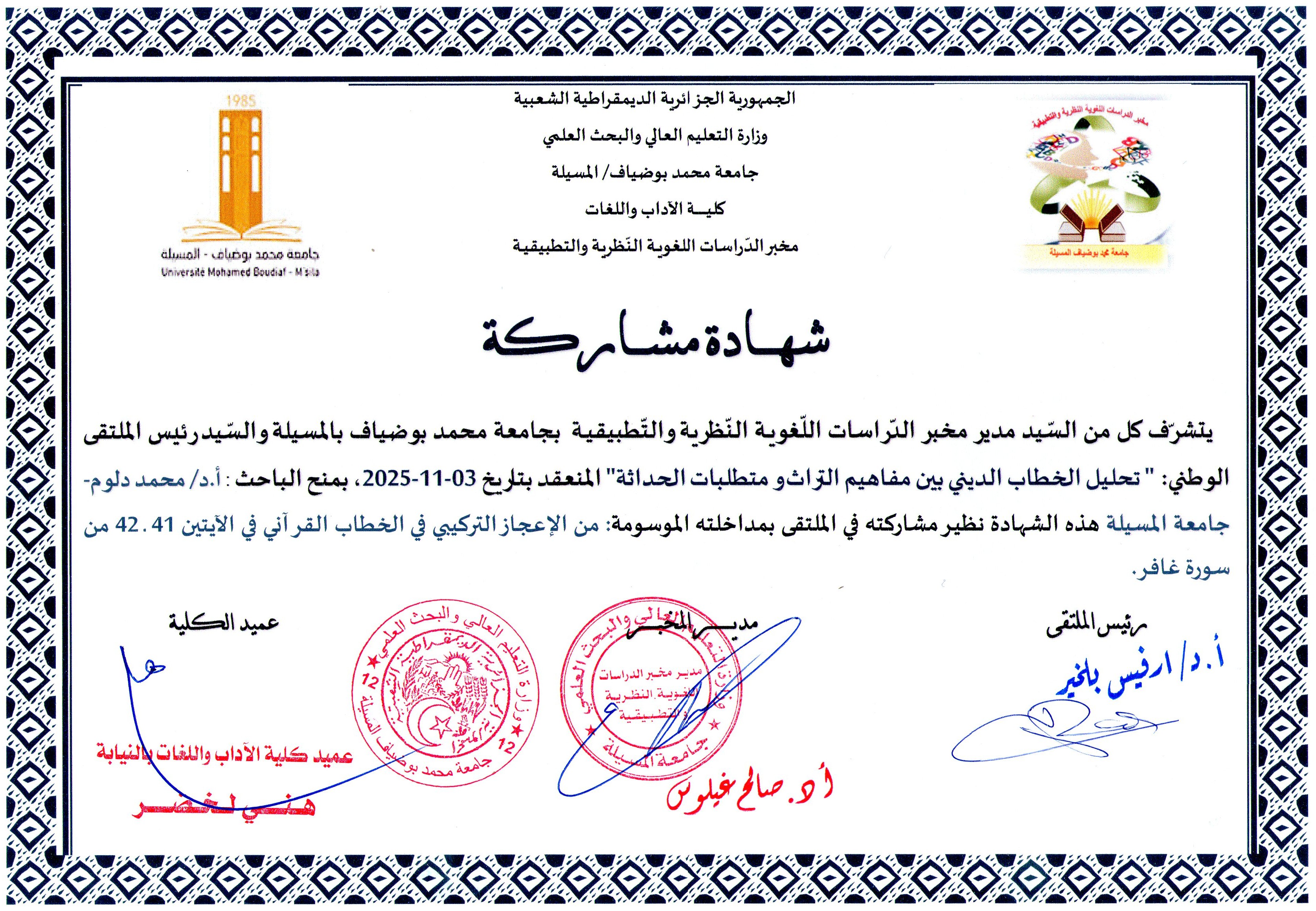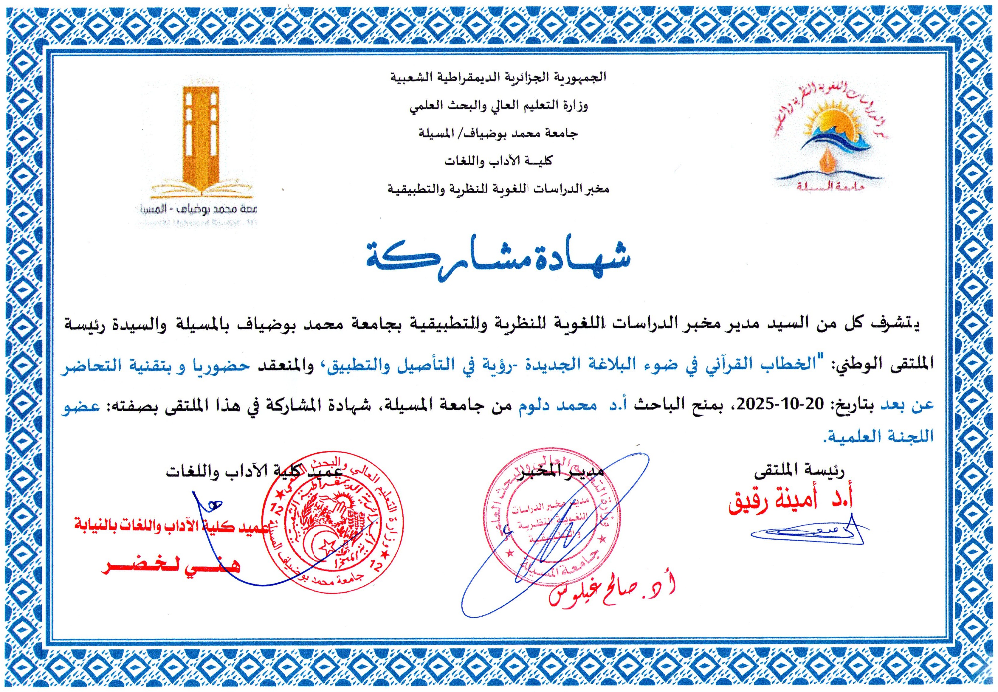 M. DELLOUM Mohamed, (2025-10-20), "عضو في اللجنة العلمية للماتقى", [national] الخطاب القرآني في ضوء البلاغة الجديدة - رؤية في التأصيل والتطيبق , جامعة محمد بوضياف ـ المسيلة