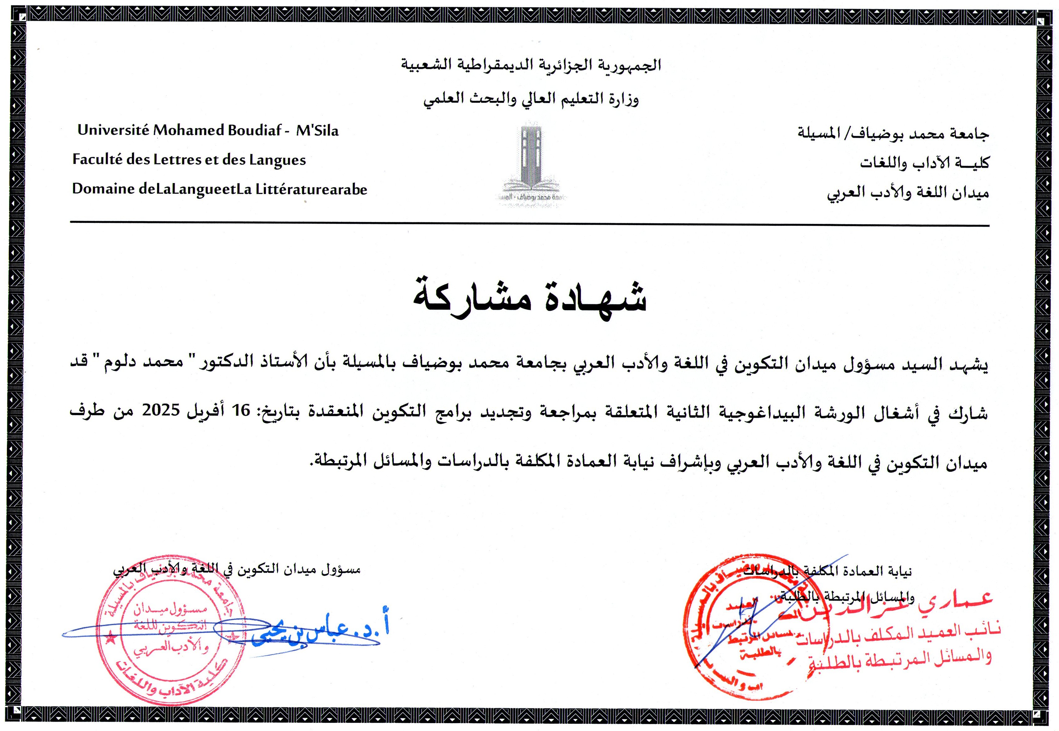 M. DELLOUM Mohamed, (0026-01-22), "يوم دكتورالي لفائدة طلبة الدكتوراه تخصص دلااسات أدبية", [national] يوم دكتورالي , جامعة محمد بوضياف ـ المسيلة