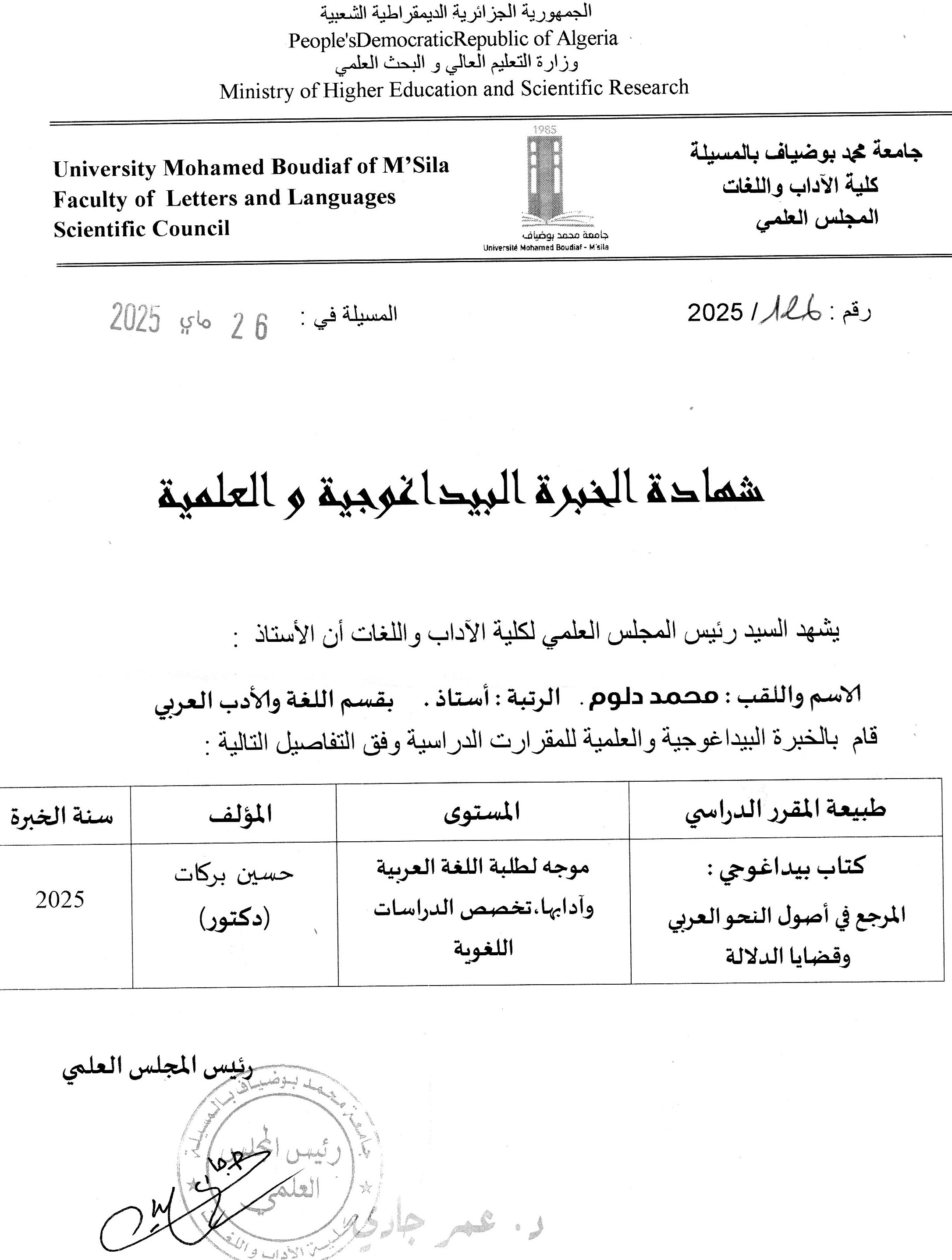 M. DELLOUM Mohamed, (2025-05-26), "المرجع في أصول النحو العربي وقضايا الدلالة للدكتور بركات الحسين", [national]