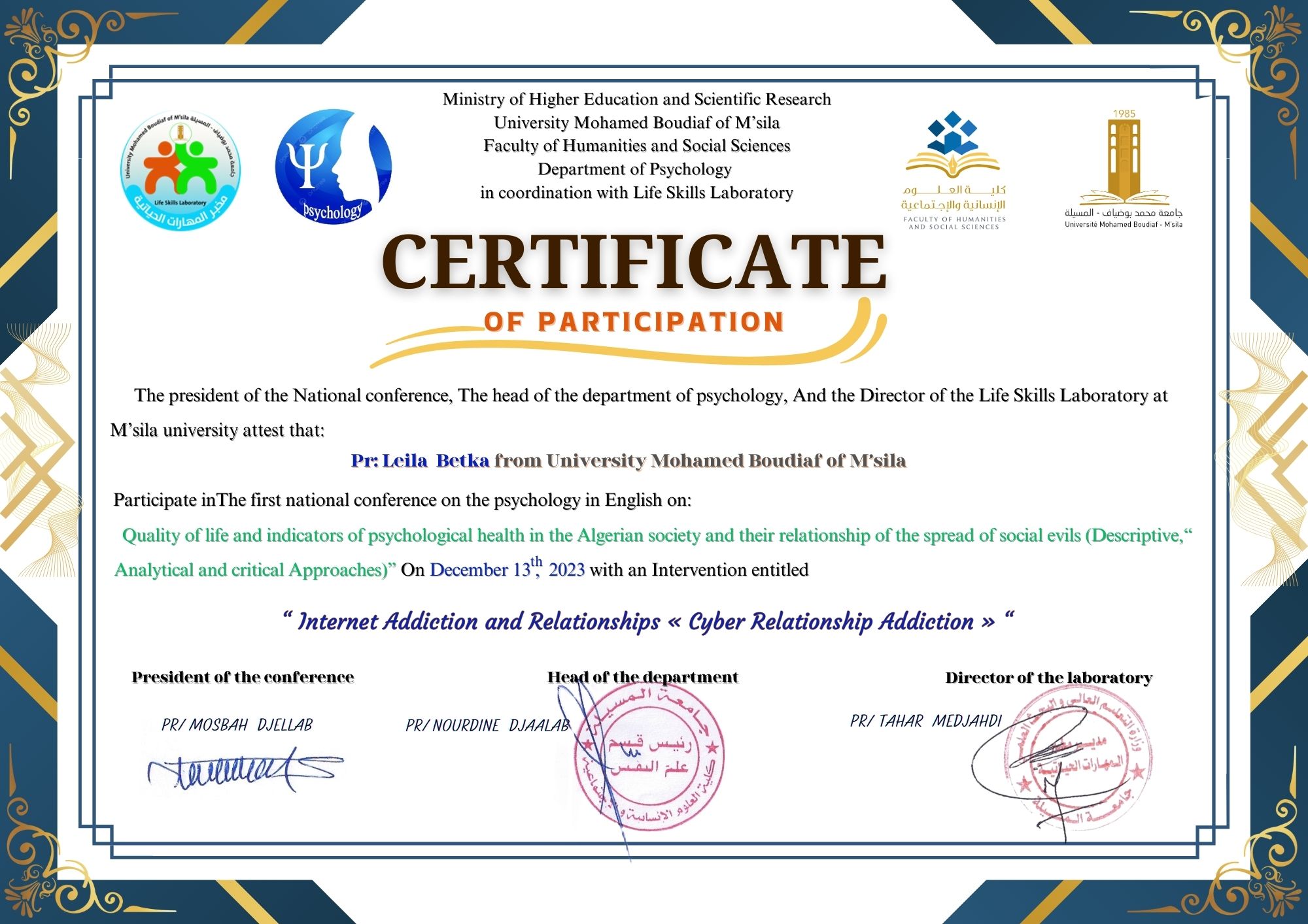 M. BETKA Leila, (2023-12-13), "Internet addiction and relationship"cyber relationship addiction"", [national] Quality of life and indicators of psychological health in the Algerian society and their relationship of the spread of social evils (descriptive, analytical and critical approaches) , جامعة المسيلة