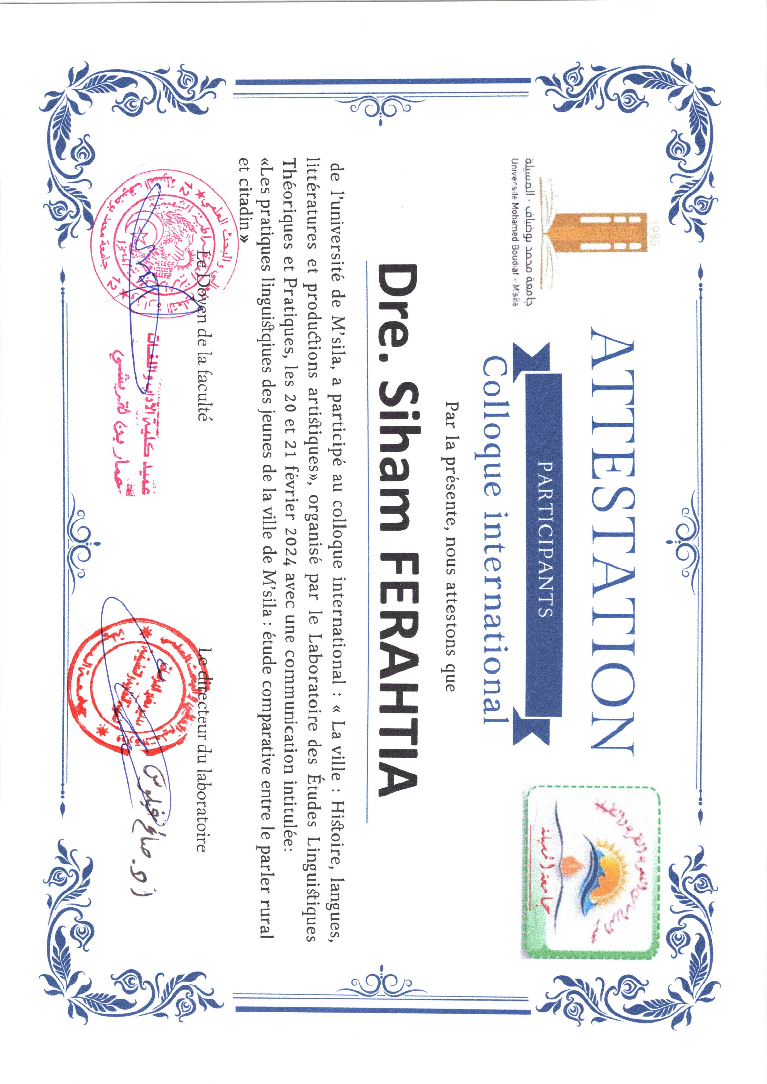 M. FERAHTIA Siham, (2024-02-20), "Les pratiques linguistiques des jeunes de la ville de M’sila : étude comparative entre le parler rural et citadin", [international] La ville : Histoire, langues, littératures et productions artistiques. , Université de m'sila