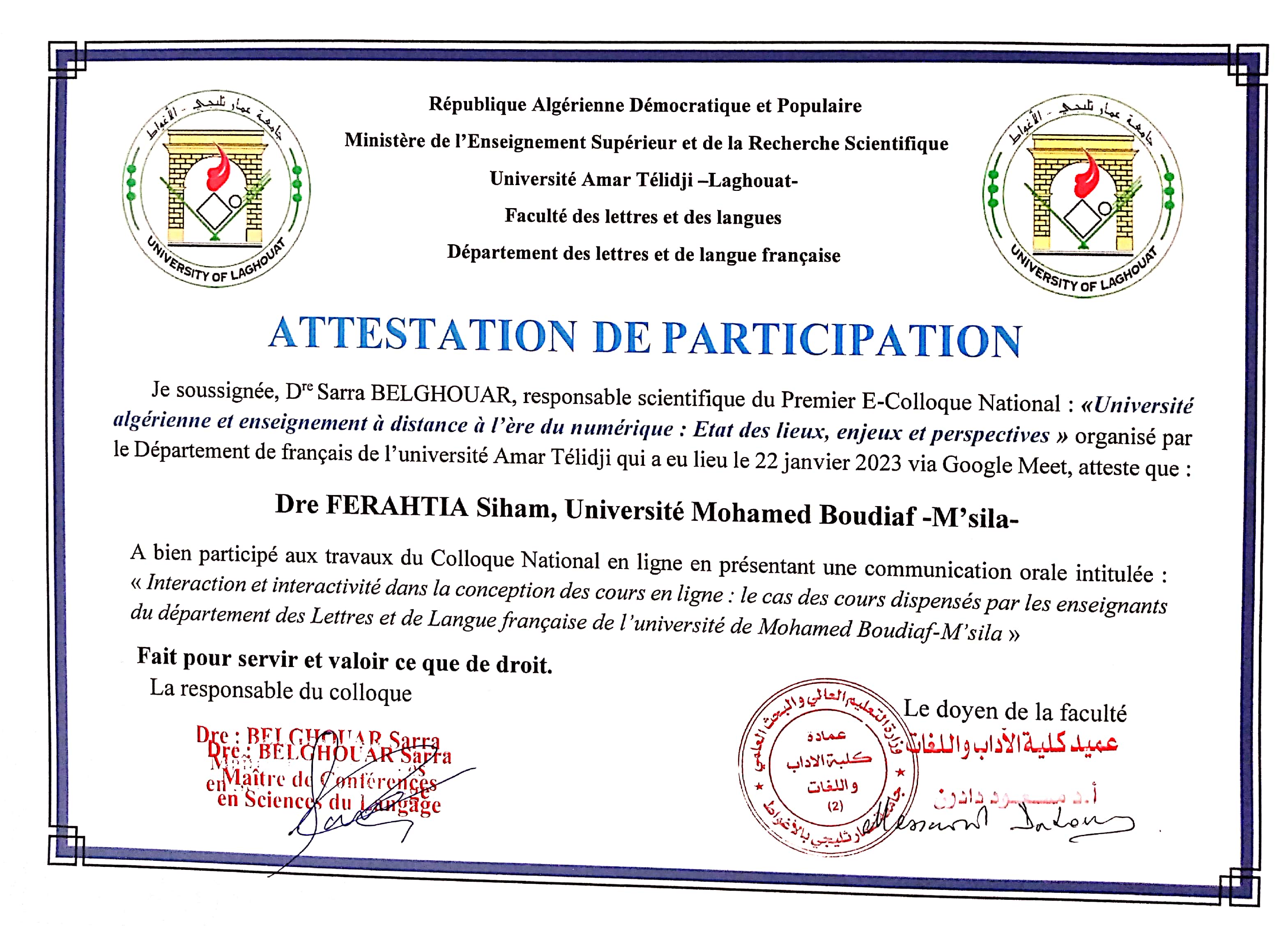 M. FERAHTIA Siham, (2024-05-06), "L’impact de l’enseignement à distance sur l’enseignement- apprentissage des langues étrangères", [national] E-Colloque National sur La numérisation à l’université : un moyen de réussite et une démarche de développement durable. , Université de m'sila