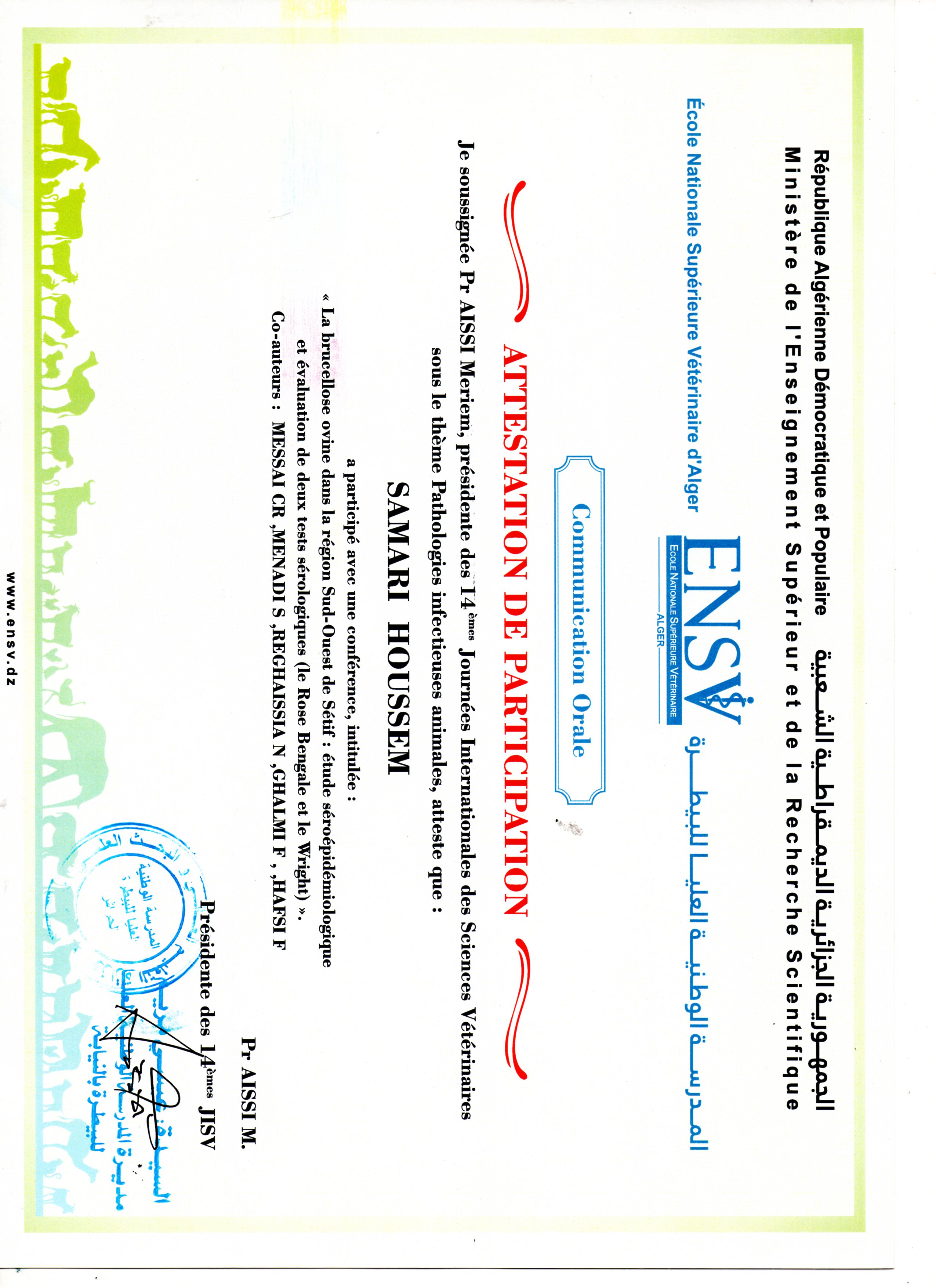 M. SAMARI Houssem, Messai chafik reda, Menadi salah, Reghaissia nassiba, Ghalmi farida, Hafsi fella, , (2019), "La brucellose ovine dans la région Sud-Ouest de Sétif : étude séro-épidémiologique et évaluation de deux tests sérologiques (le Rose Bengale et le Wright).", [international] La 14ème journée Internationales des Sciences Vétérinaires sous le thème Pathologie Infectieuses Animales , ENSV d'Alger