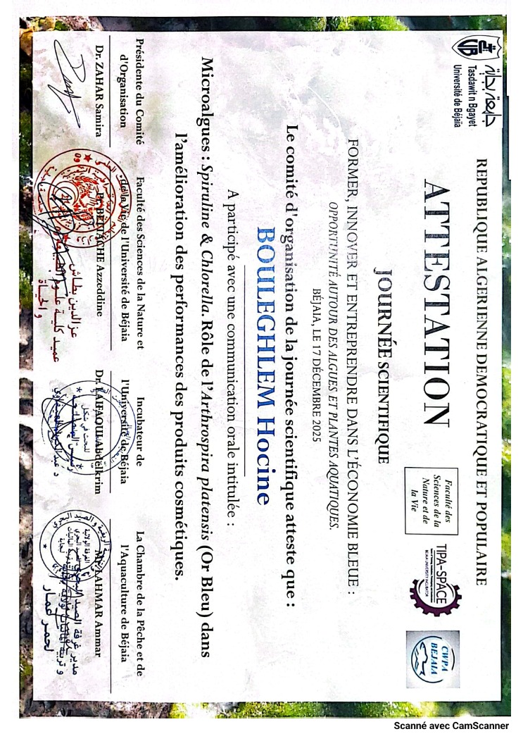 M. BOULEGHLEM Hocine, (2025-12-17), "Rôle de l'Arthrospira platensis (Or Bleu) dans l’amélioration des performances des produits cosmétiques", [national] Journée scientifique sur les algues et les plantes aquatiques dans la wilaya de Béjaïa 17 Décembre 2025 , Béjaia