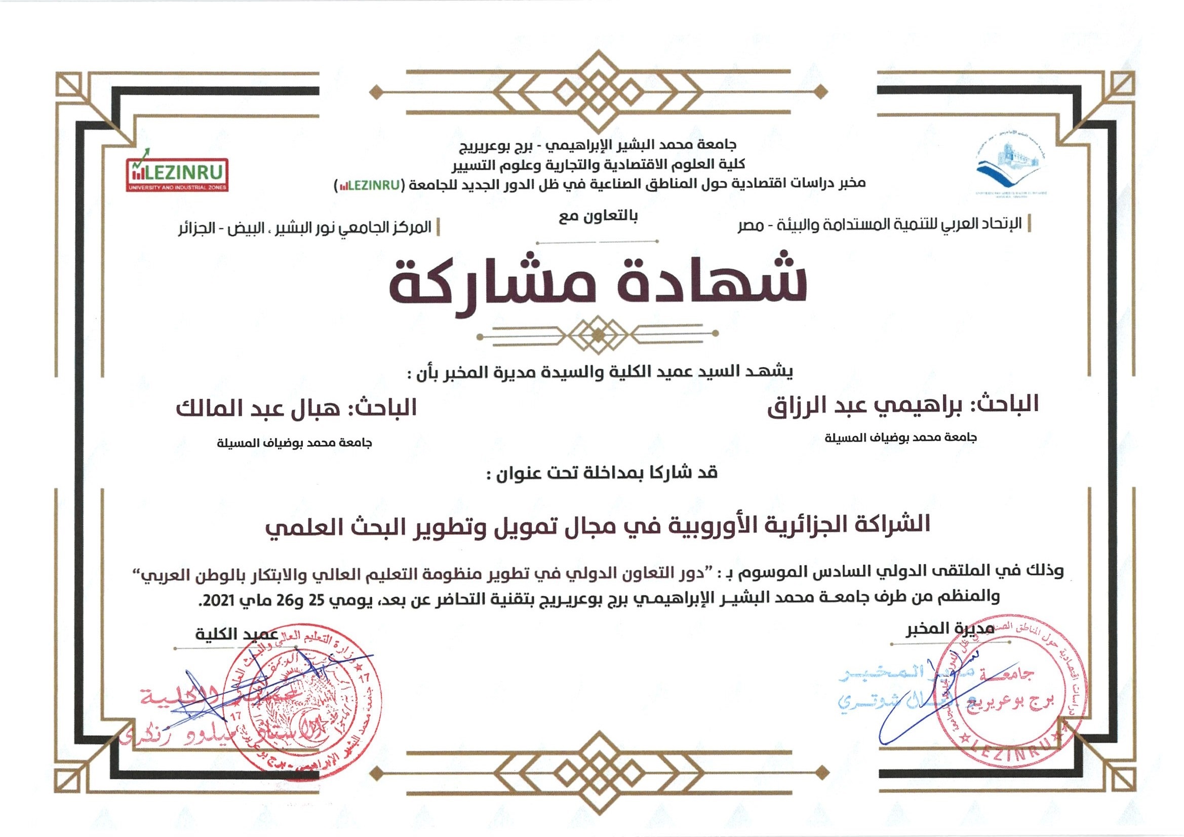 M. HEBAL Abdelmalek, (2021), "الشراكة الجزائرية الأوروبية في مجال تمويل وتطوير البحث العلمي", [international] دور التعاون الدولي في تطوير منظومة التعليم العالي والابتكار في الوطن العربي" , كلية العلوم الاقتصادية علوم التسيير والعلوم التجارية/جامعة محمد البشير الابراهيمي برج بوعريريج