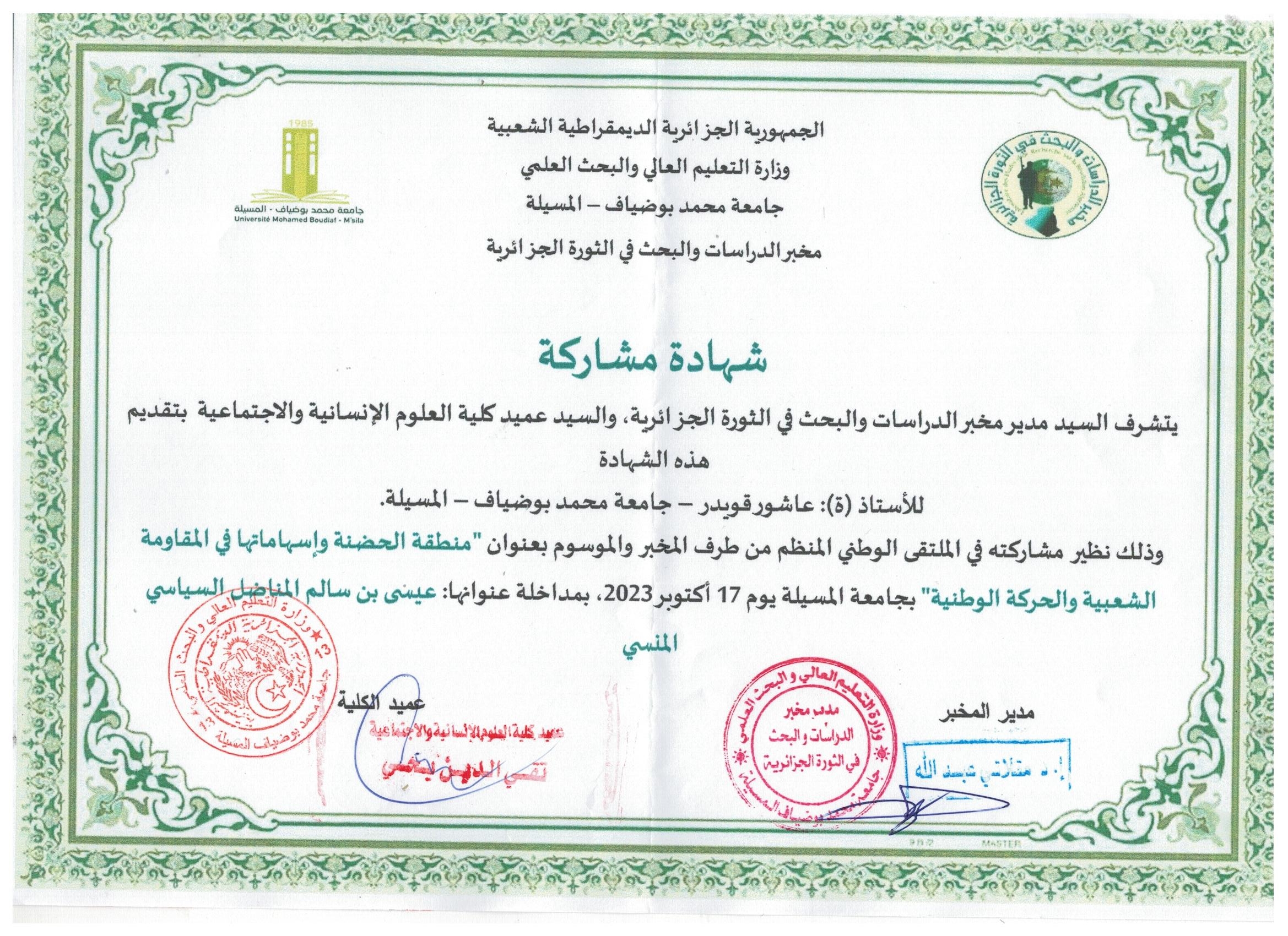 M. ACHOUR Kouider, (2022), "انعكاسات مجازر 08ماي 1945 على مسار الحركة الوطنية", [national] ندوة وطنية تاريخية حول مجازر 8ماي 1945 -جرائم لا تنسى , جامعة المسيلة