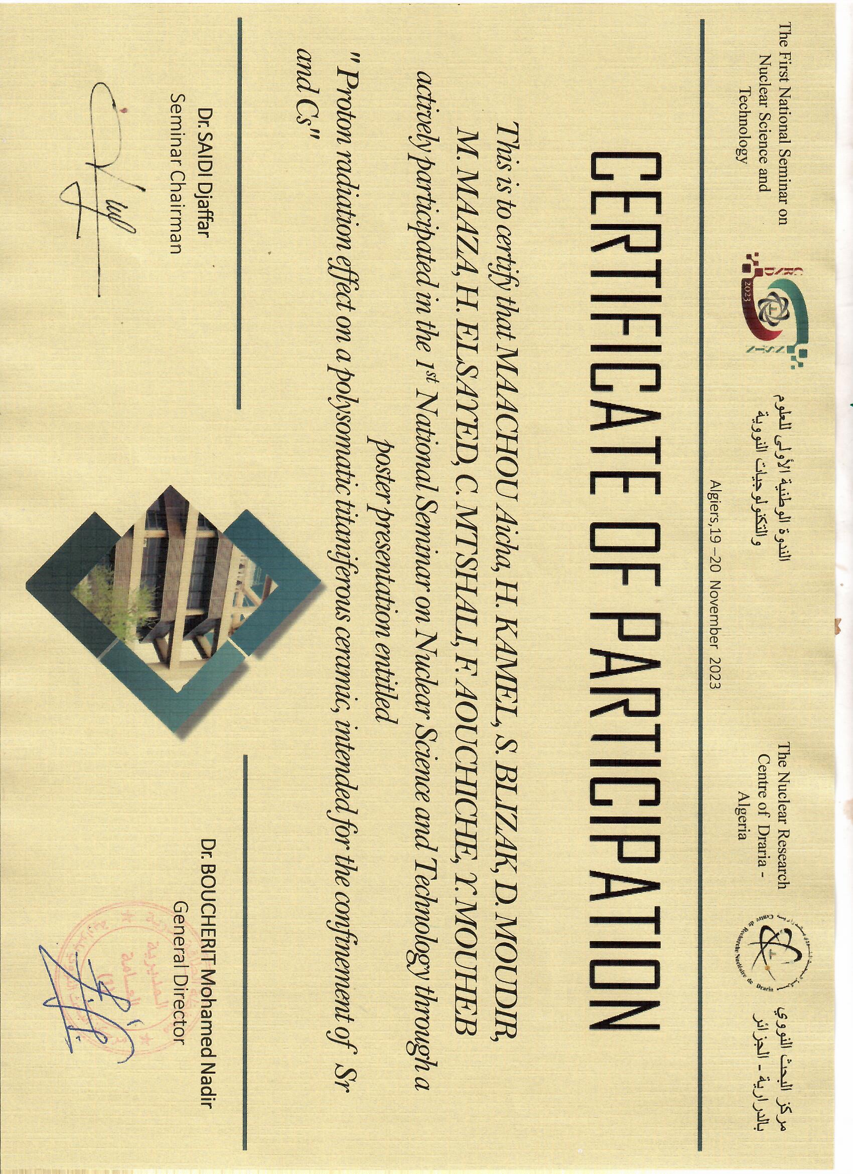 M. BLIZAK Salah, MAAVHOU Aicha, Nour El Hayet Kamel, Dalila Moudir, , (2023-11-19), "Proton radiation effect on a titaniferous ceramic, intended for the confinement of Sr and Cs", [national] The 1st national seminar on nuclear science and technology , CRND-Draria-Algiers