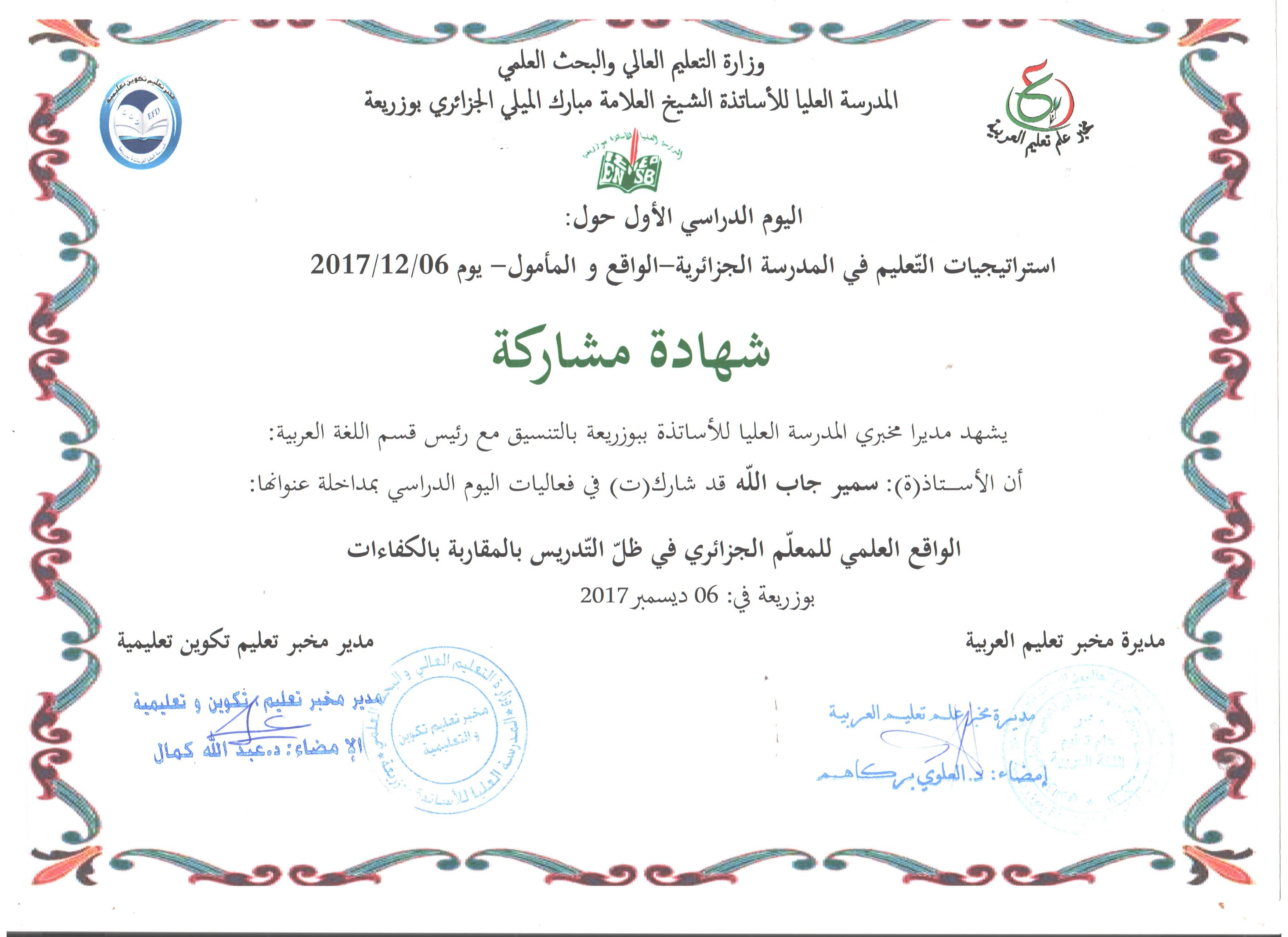 M. DJABALLAH Samir, (2017-12-06), "الواقع العلمي للمعلم الجزائري في ظل التدريس بالمقاربة بالكفاءات", [national] استراتيجيات التعليم في المدرسة الجزائرية -الواقعوالمأول - , -المدرسة العليا للأساتذة -بوزريعة