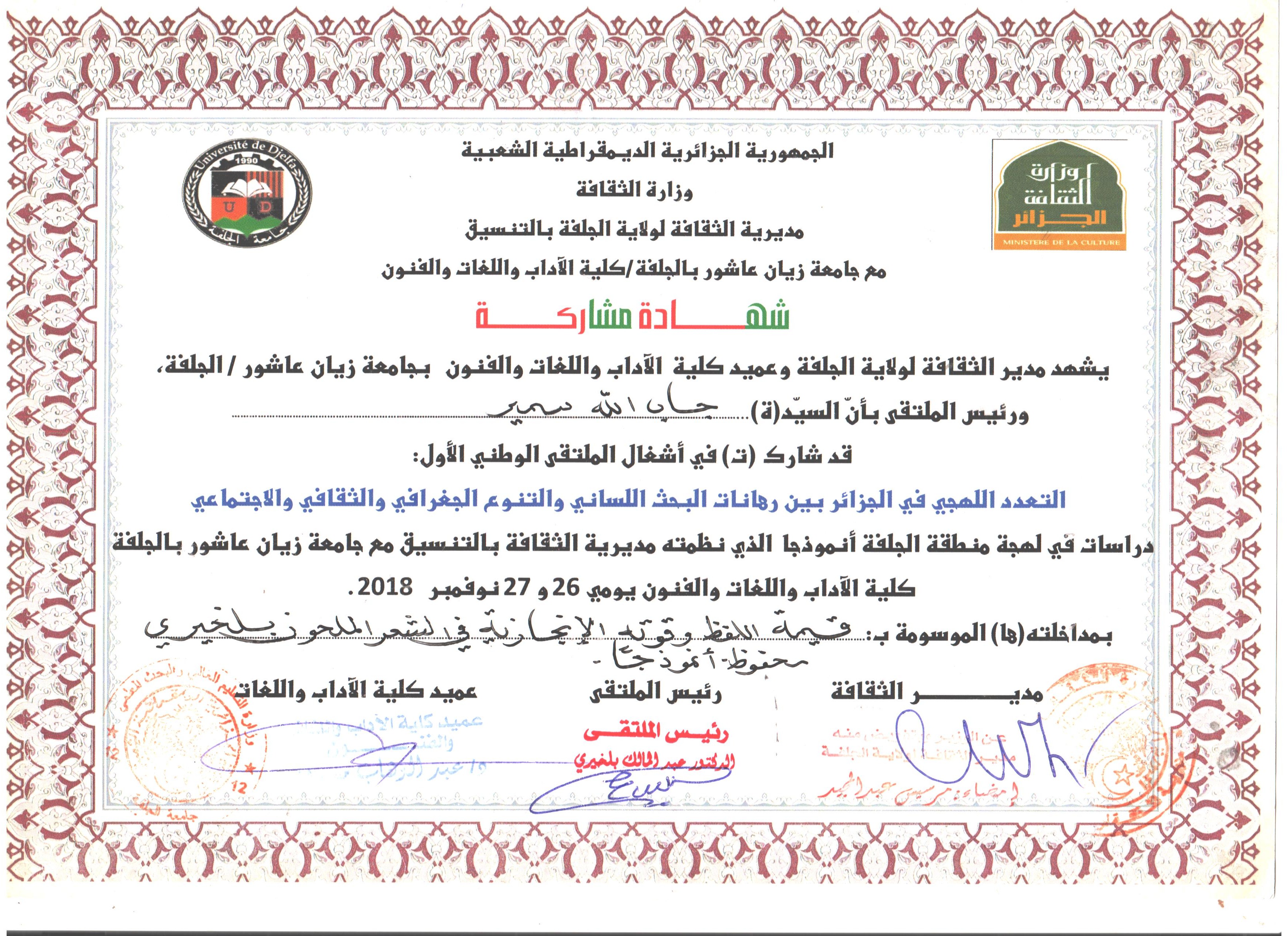 M. DJABALLAH Samir, (2018-11-26), "قيمة اللفظ وقوته الإنجازية في الشعر الملحون بلخيري محفوظ أنموذجا", [national] التعدد اللهجي في الجزائر بين رهانات البحث اللساني والتنوع الجغرافي والثقافي والإجتماعي , جامعة الجلفة