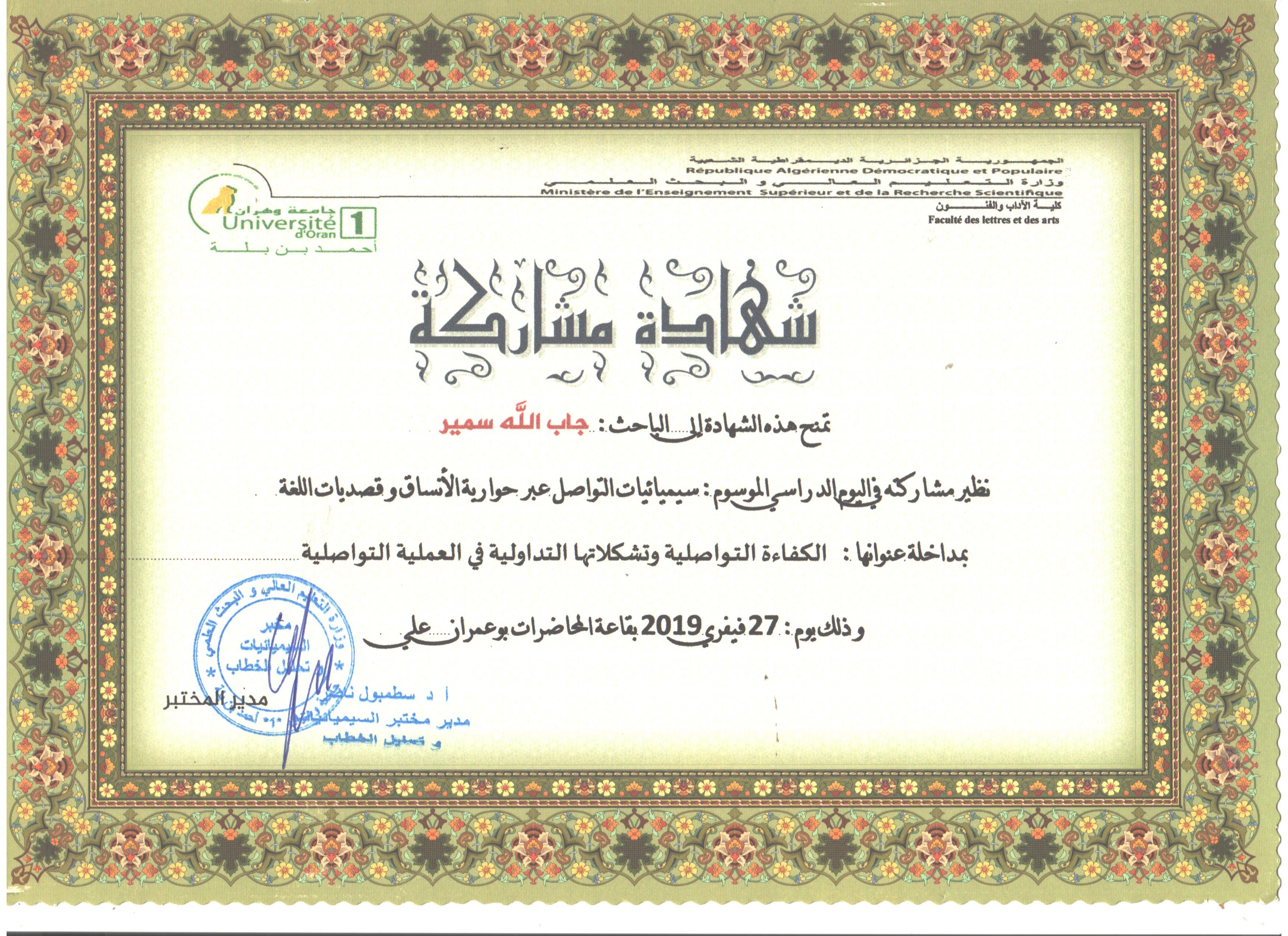 M. DJABALLAH Samir, (2019-02-27), "الكفاءة التواصلية وتشكلاتها التداولية في العملية التواصلية", [national] سيميائيات التواصل عبر حوارية الأنساق وقصديات اللغة , جامعة وهران-01