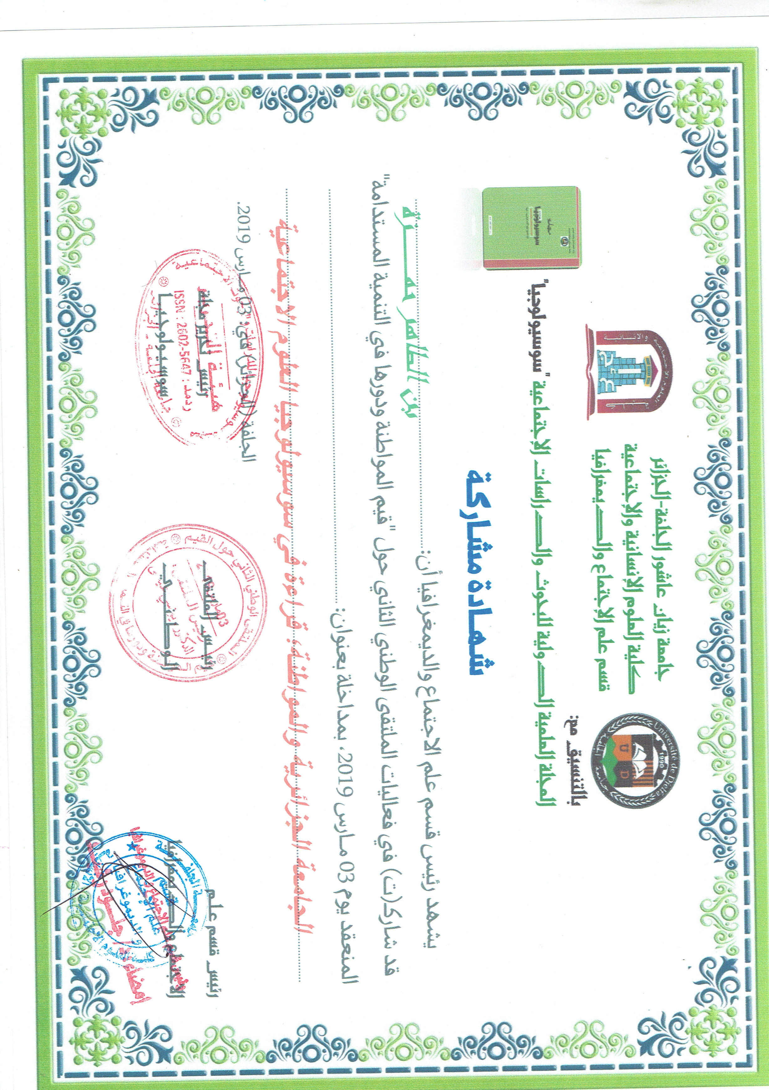 M. BENTAHAR Hamza, (2019-03-03), "الجامعة الجزائرية والمواطنة؛ قراءة في سوسيولوجيا العلوم الاجتماعية", [national] قيم المواطنة ودورها في التنمية المستدامة , بجامعة – زيان عاشور- الجلفة. الجزائر،