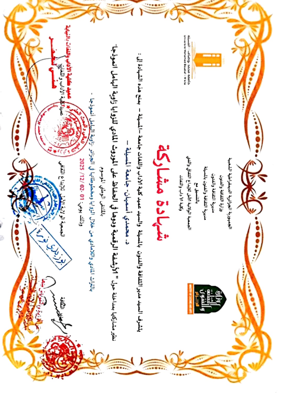 M. MHAMDI Ismahane, (2025-12-01), "الارشفة الرقمية ودورها في الحفاظ على الموروث المتدي للزوايا", [national] التراث المادي و اللامادي من خلال الوزايا ومخطوطاتها في الجزائر , جامعة المسيلة
