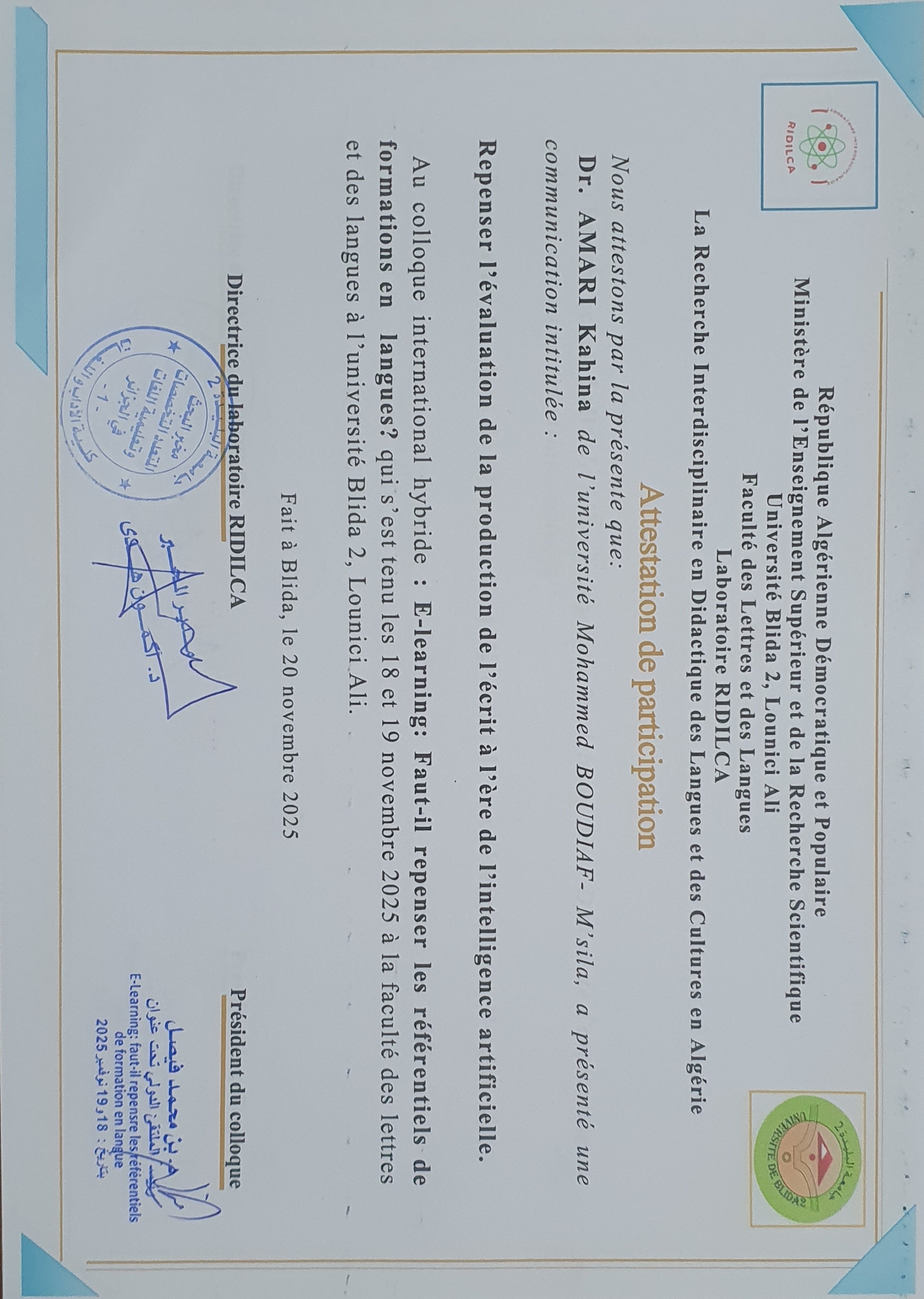 M. AMARI Kahina, (2025-11-18), "Repenser l’évaluation de la production de l’écrit à l’ère de l’intelligence artificielle.", [international] E-learning : faut-il repenser les féréentiels des formations en langues ? , université Blida 2