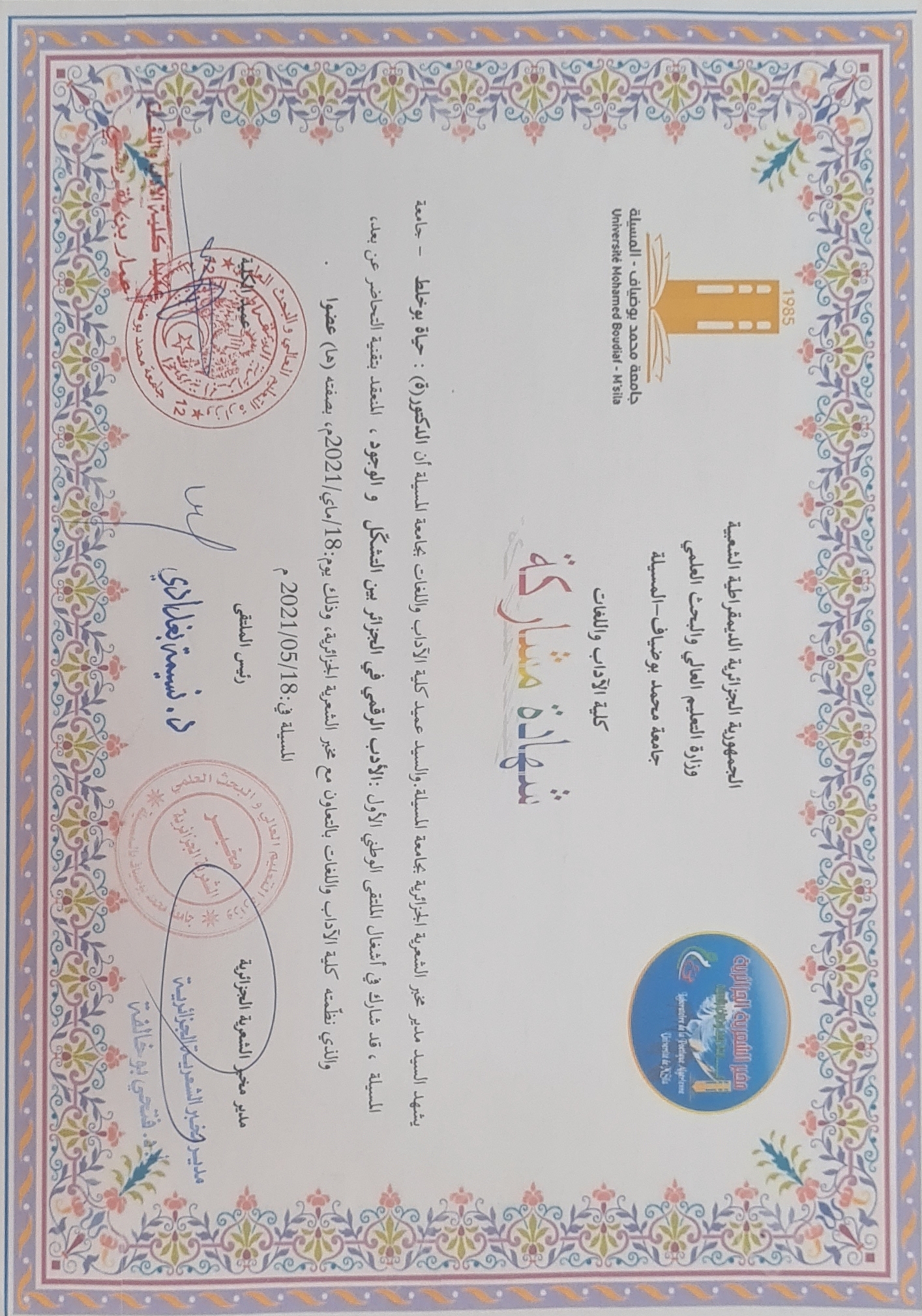 M. BOUKHALAT Hayat, (2021-05-18), "الأدب الرقمي في الجزائر", [national] الأدب الرقمي في الجزائر بين التشكل و الوجود , جامعة محمد بوضياف المسيلة
