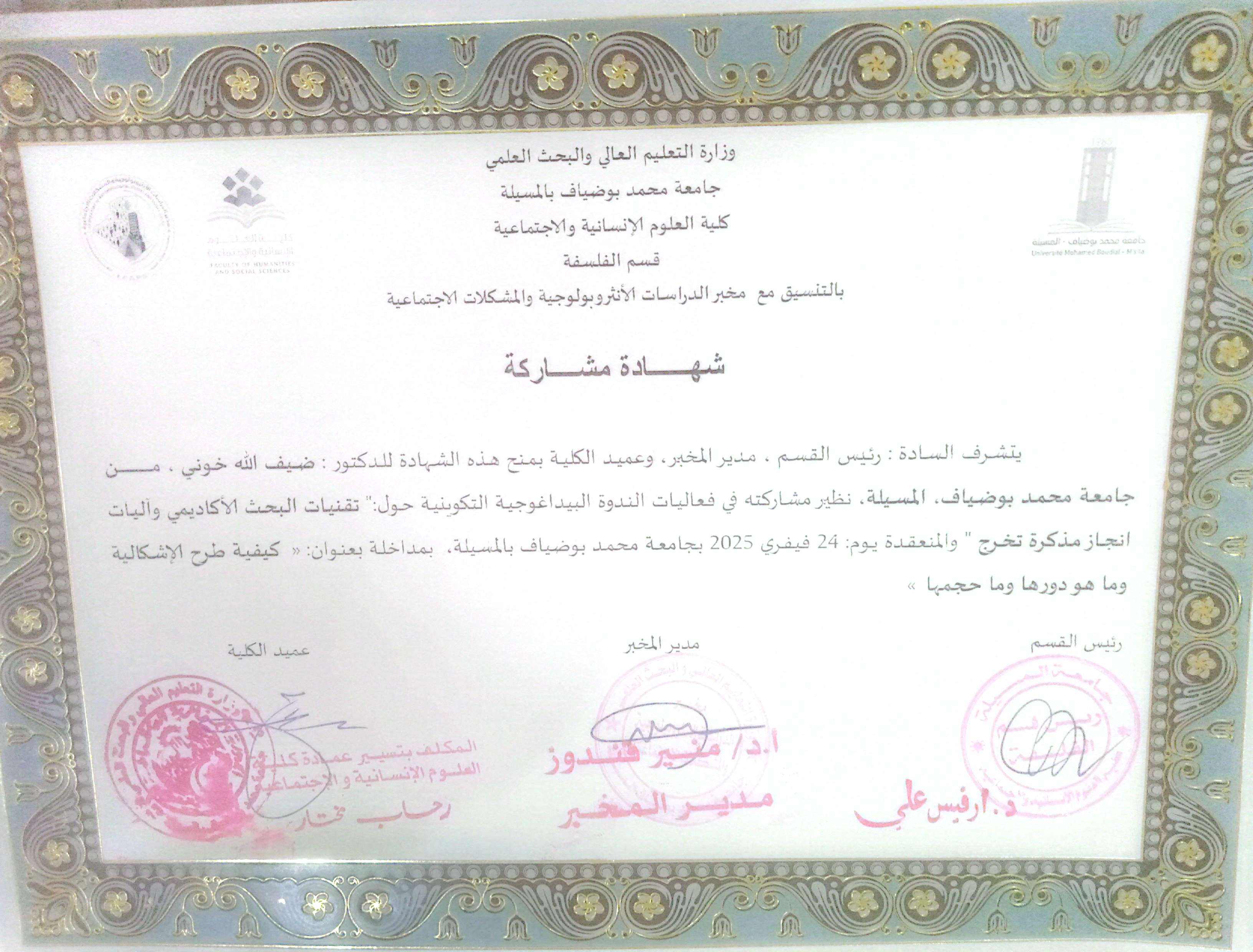 M. DIFFALAH Khaouni, (2023), "الفلسفة العربية الاسلامية و الاشكاليات الراهنة لفائدة طلبة الدكتوراه", [national] الفلسفة العربية الاسلامية و الاشكاليات الراهنة لفائدة طلبة الدكتوراه , جامعة المسيلة