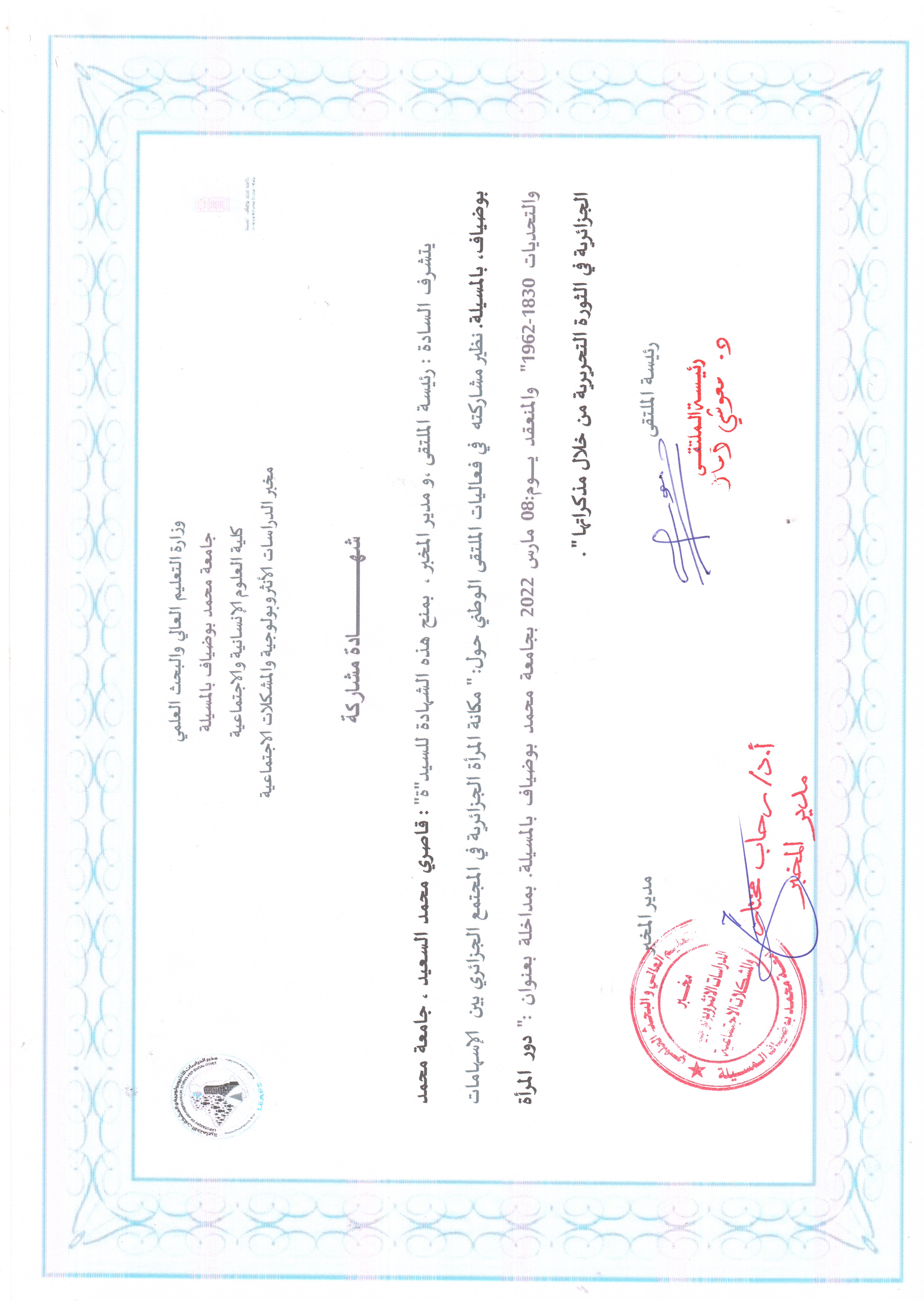 M. KASRI Mohamed said, (2022-03-08), "دور المرأة الجزائرية في الثورة التحريرية من خلال مذكراتها", [national] مكانة المرأة الجزائرية في المجتمع الجزائري بين الإسهامات والتحديات , جامعة المسيلة