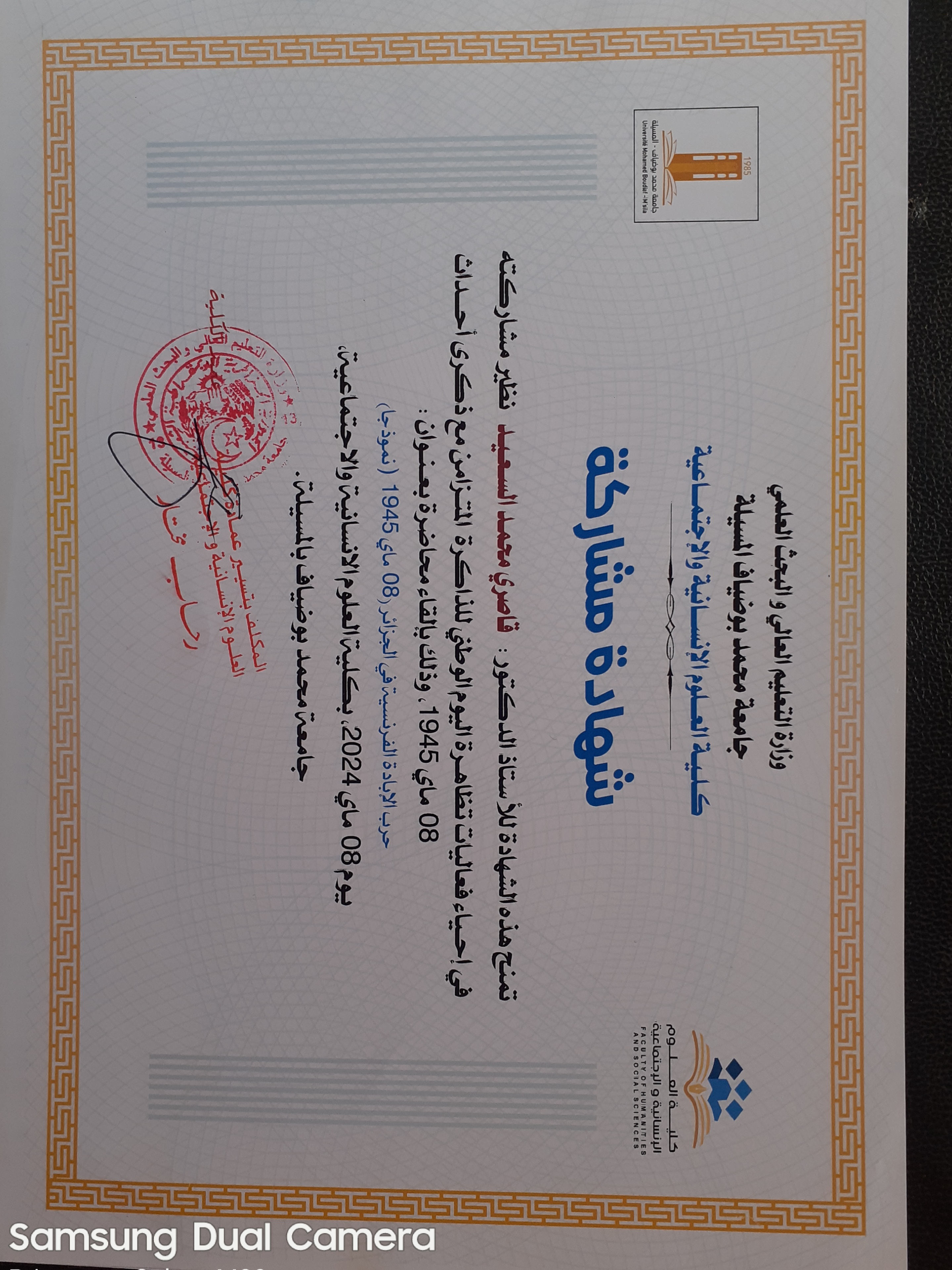 M. KASRI Mohamed said, (2024-05-08), "حرب الإبادة الفرنسية في الجزائر 8 ماي 45 أنموذجا", [national] تظاهرة اليوم الوطني للذاكرة , جامعة محمد بوضياف المسيلة