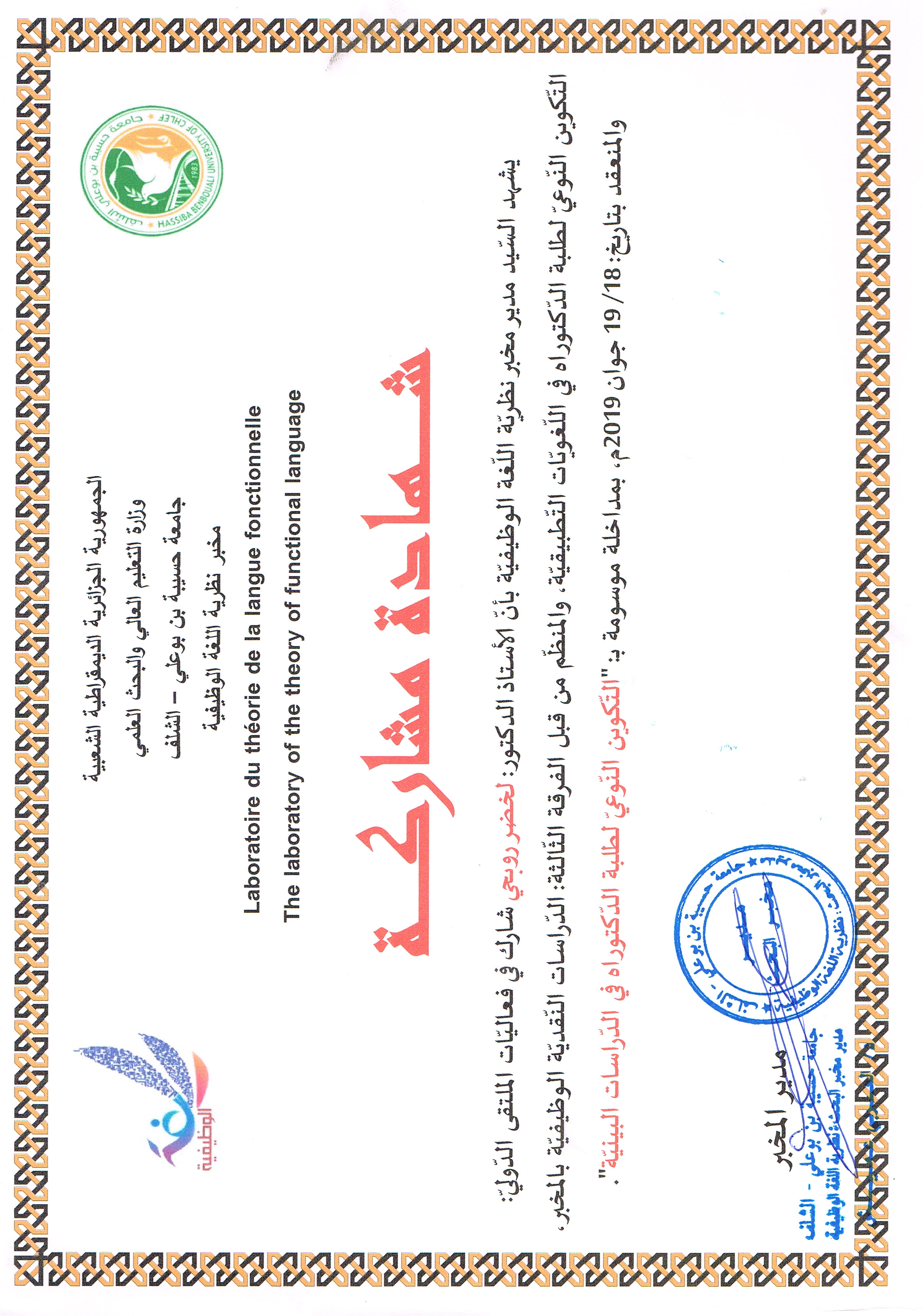 M. ROUBHI Lakhdar, (2019), "التكوين النوعي لطلبة الدكتوراه في الدراسات البينية", [international] التكوين النوعي لطلبة الدكتوراه في اللغويات التطبيقية , جامعة الشلف