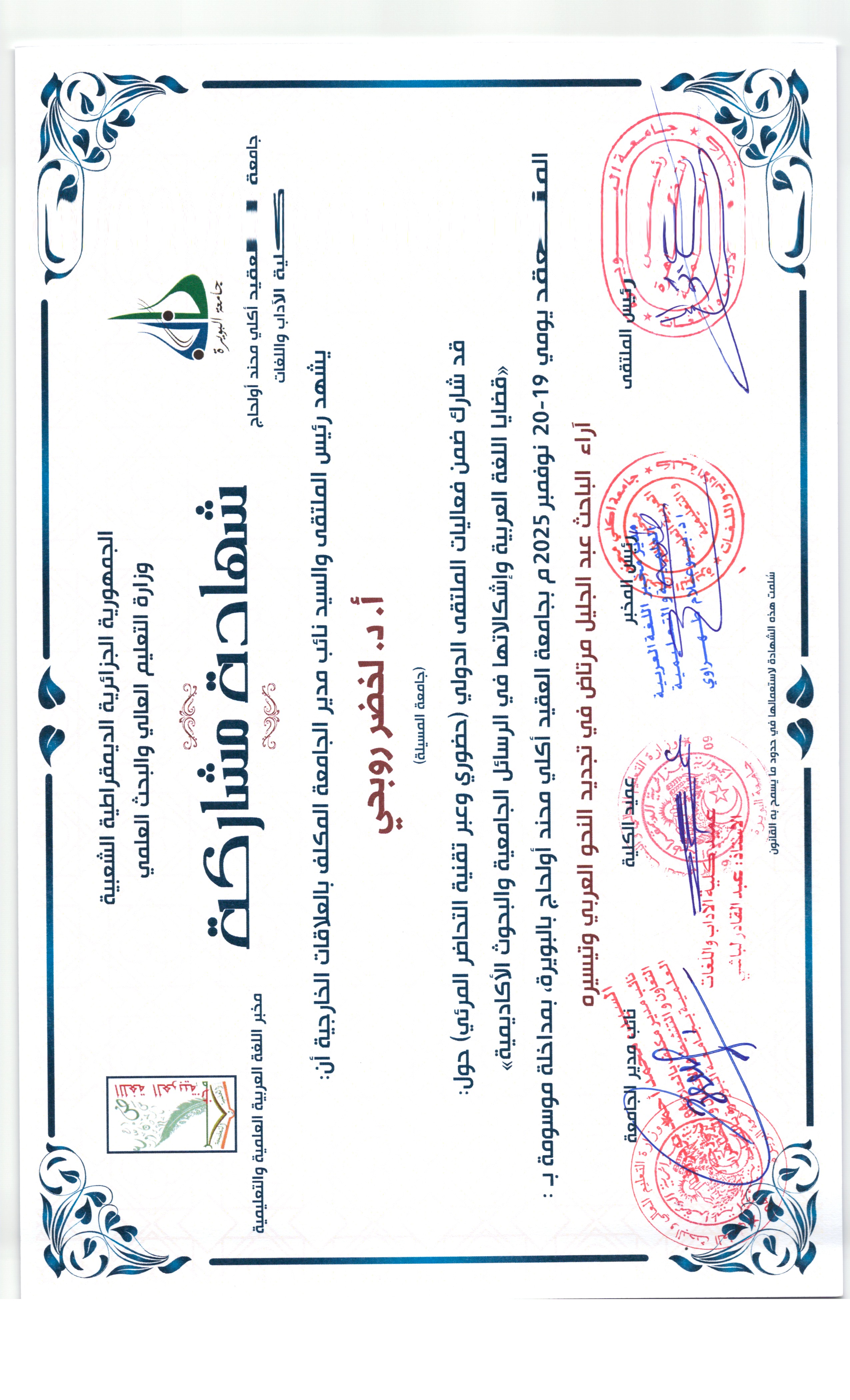 M. ROUBHI Lakhdar, (2025-11-19), "آراء الباحث عبد الجليل مرتاض في تجديد البحث العربي وتيسيره", [international] قضايا اللغة العربية وإشكالاتها في الرسائل الجامعية والبحوث الأكادمية , جامعة البويرة