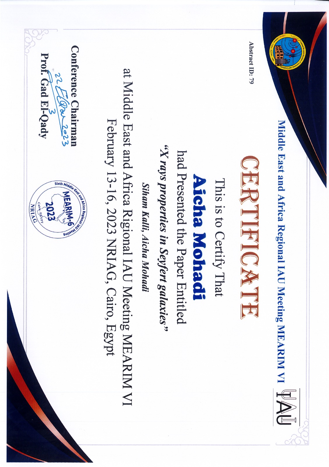 M. KALLI Siham, Aicha Mohadi, , (2023), "X rays properties in Seyfert galaxies", [international] Mearim VI- Sixth Middle-East and Africa Regional IAU Meeting , The National Research Institute of Astronomy and Geophysics (NRIAG), Cairo, Egypt.