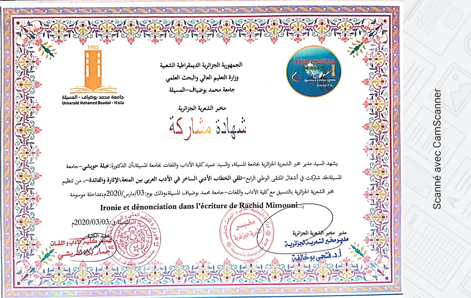 M. HOUICHI Abla, (2020), "Ironie et dénonciation dans l'écriture de Rachid Mimouni", [national] تلقي الخطاب الأدبي الساخر في الأدب العربي المعاصر بين المتعة، الاثارة و الفائدة , université Mohamed Boudiaf M'sila