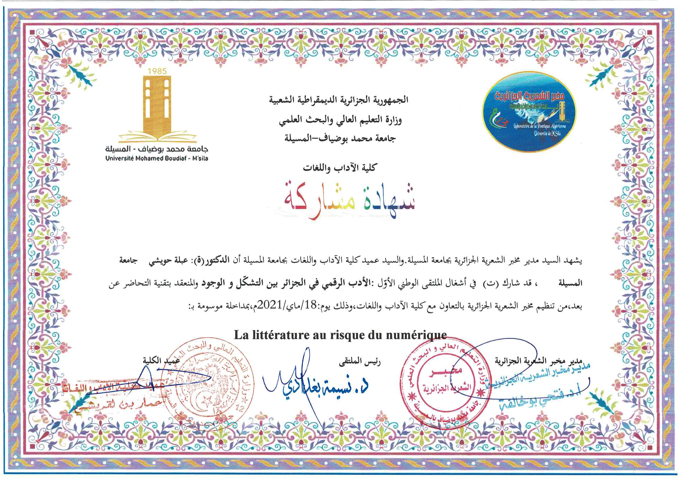 M. HOUICHI Abla, (2021), "La littérature au risque du numérique", [national] الأدب الرقمي في الجزائر بين التشكل والوجود , université Mohamed Boudiaf M'sila