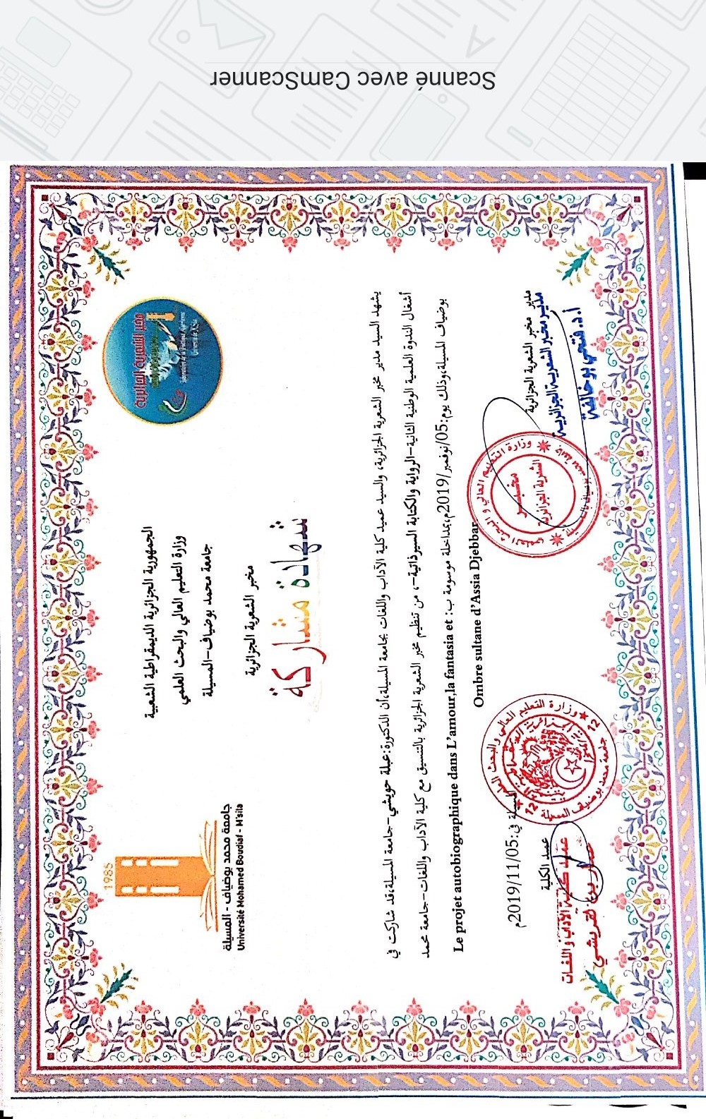M. HOUICHI Abla, (2019), "Le projet autobiographique dans L'Amour, la fantasia et Ombre sultane d’Assia Djebar", [national] Le roman algérien et l’écriture autobiographique , université Mohamed Boudiaf M'sila