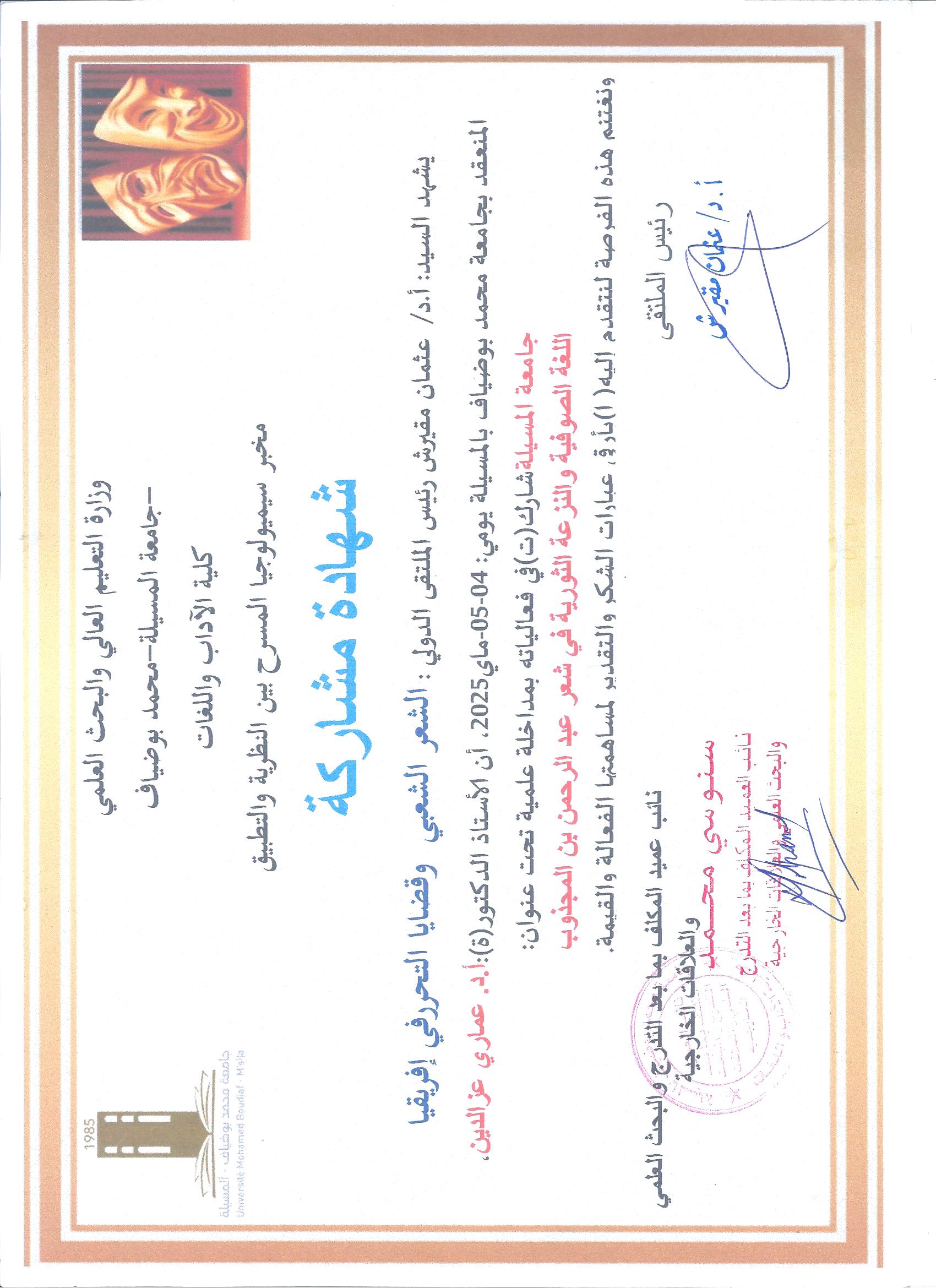 M. AMMARI Azzeddine, (2025-05-04), "اللغة الصوفية والنزعة الثورية في شعر عبد الرحمن بن المجذوب", [international] الشعر الشعيبي وقضايا التحرر في إفريقيا , جامعة المسيلة