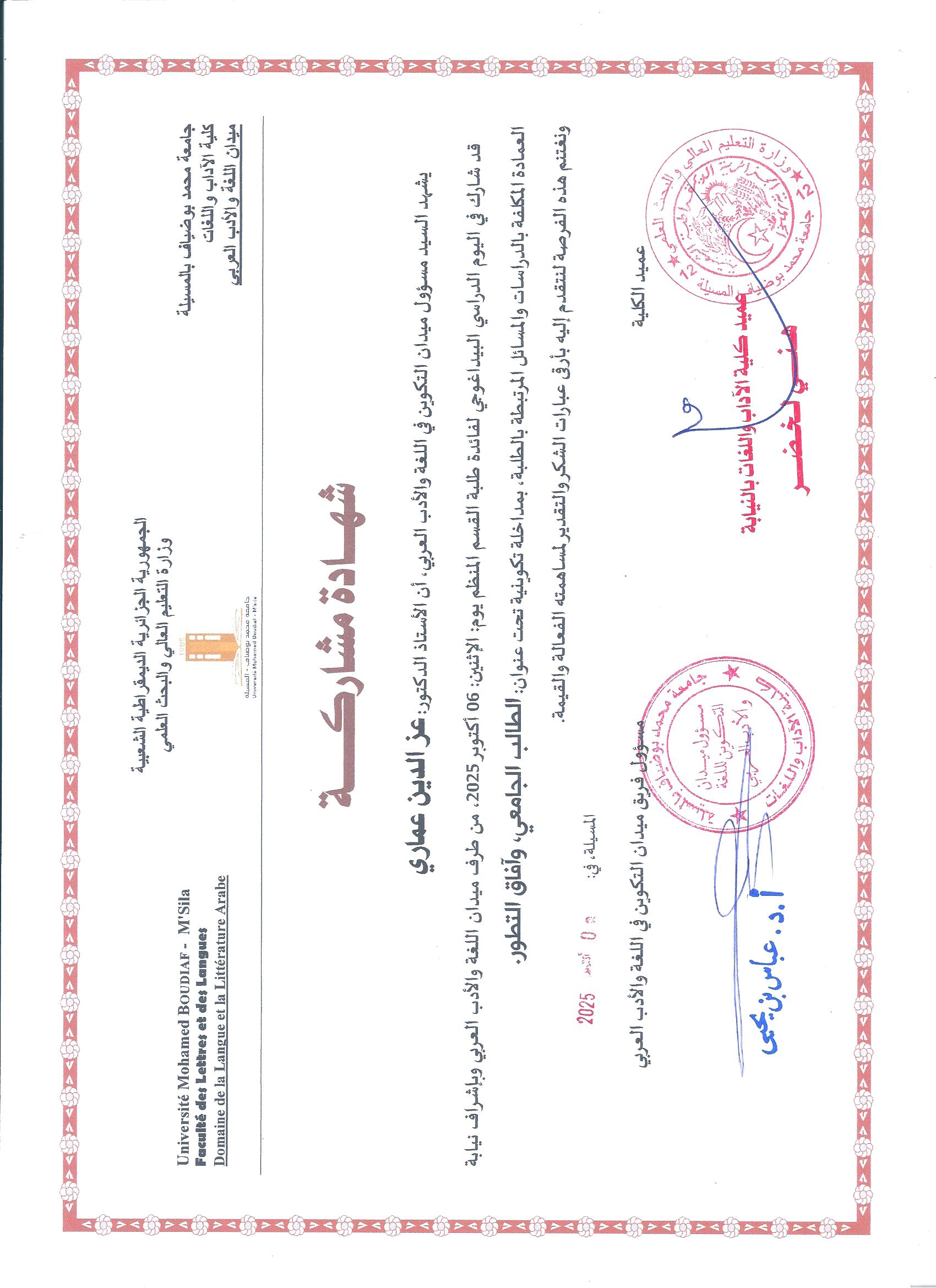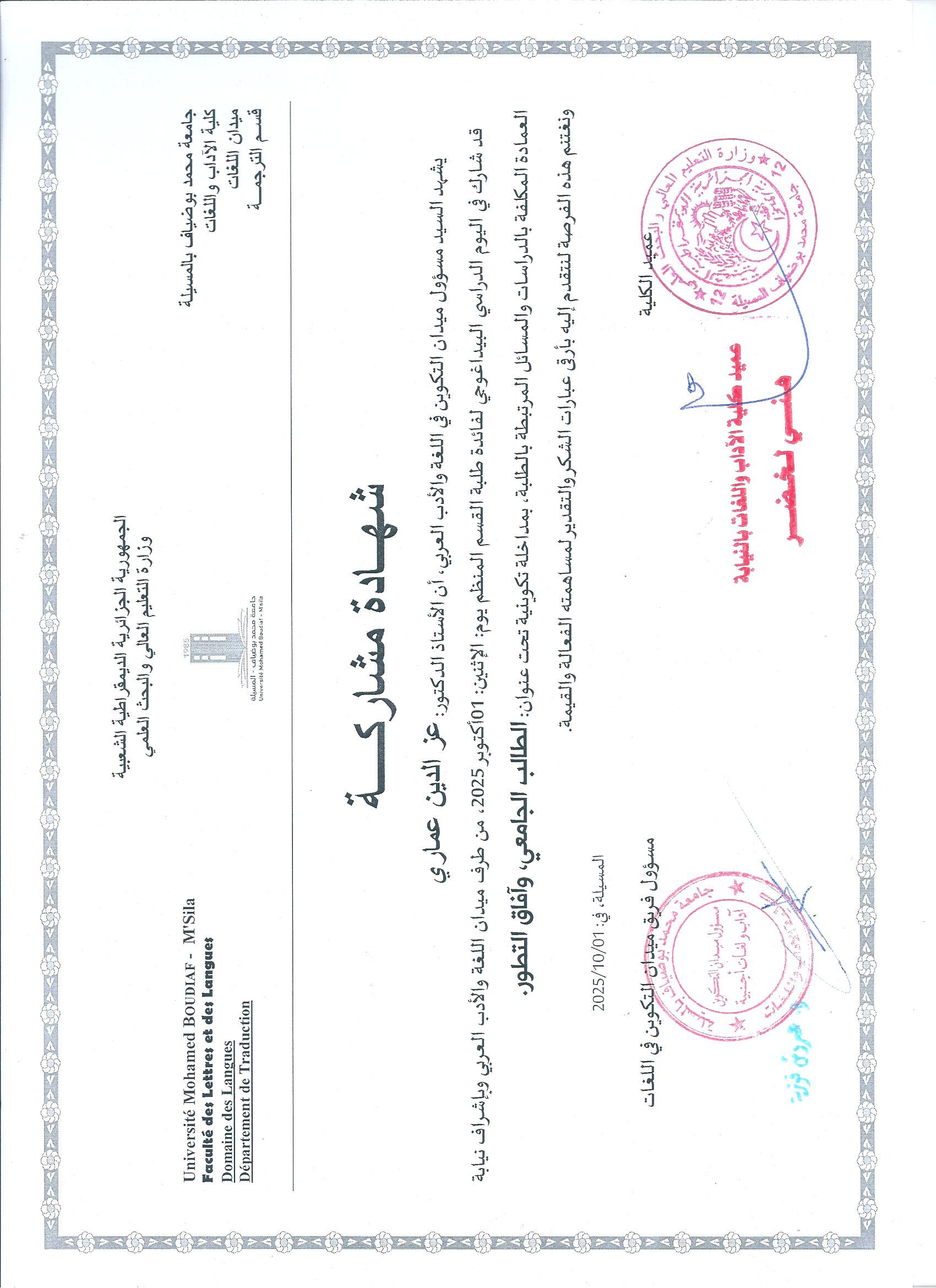 M. AMMARI Azzeddine, (2025-10-01), "الطالب الجامعي وآفاق التطور", [national] اليوم الدراسي البيداغوجي لفائدة طلبة قسم اللغة العربية , جامعة المسيلة