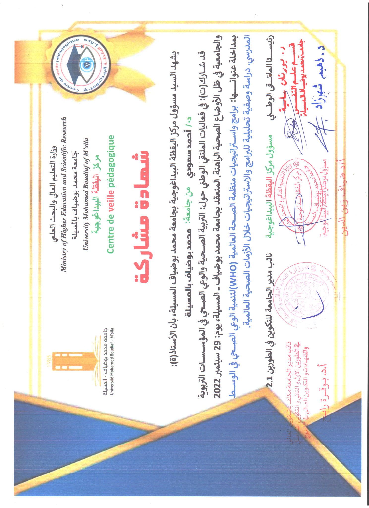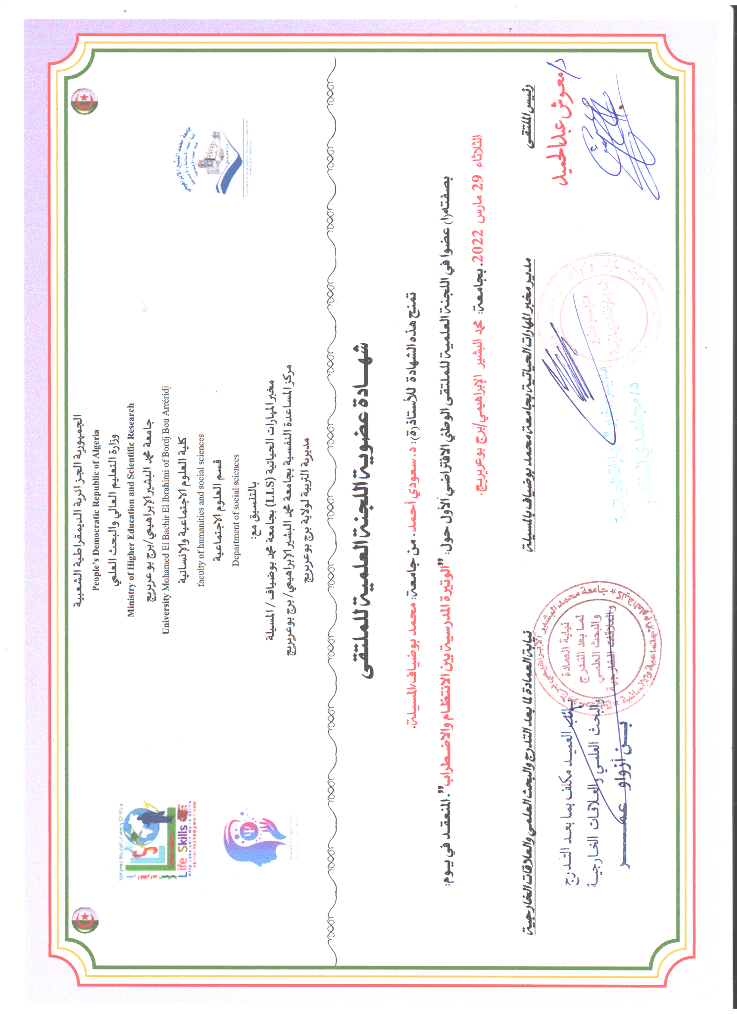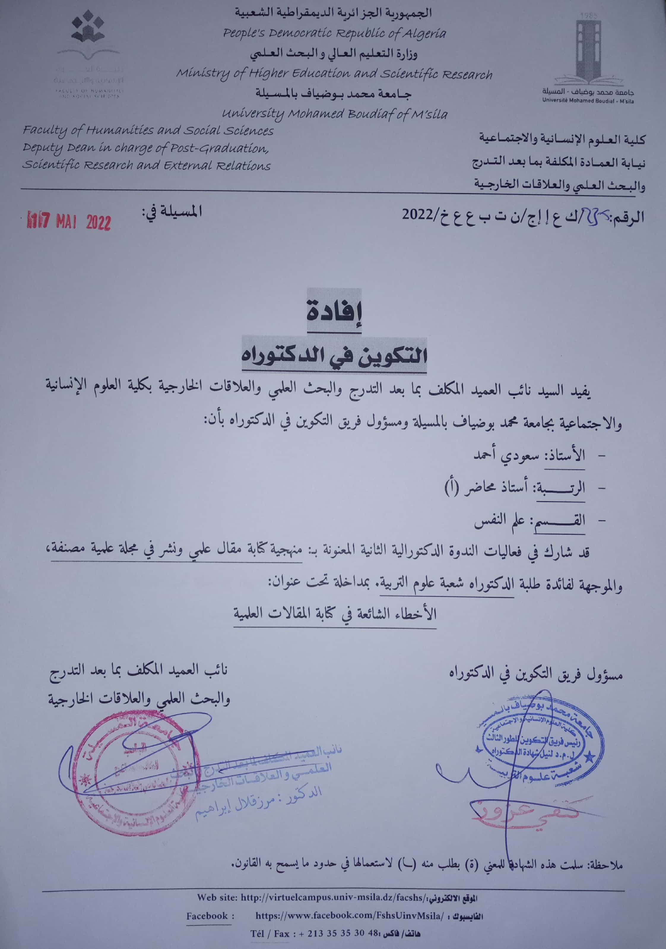 M. SAOUDI Ahmed, (2020-10-01), "المناخ العلمي بين األستاذ والطالب في الجامعة الجزائرية البحث العلمي، األخالق، المرافقة", [national] , مركز اليقظة البيداغوجية /جامعة المسيلة