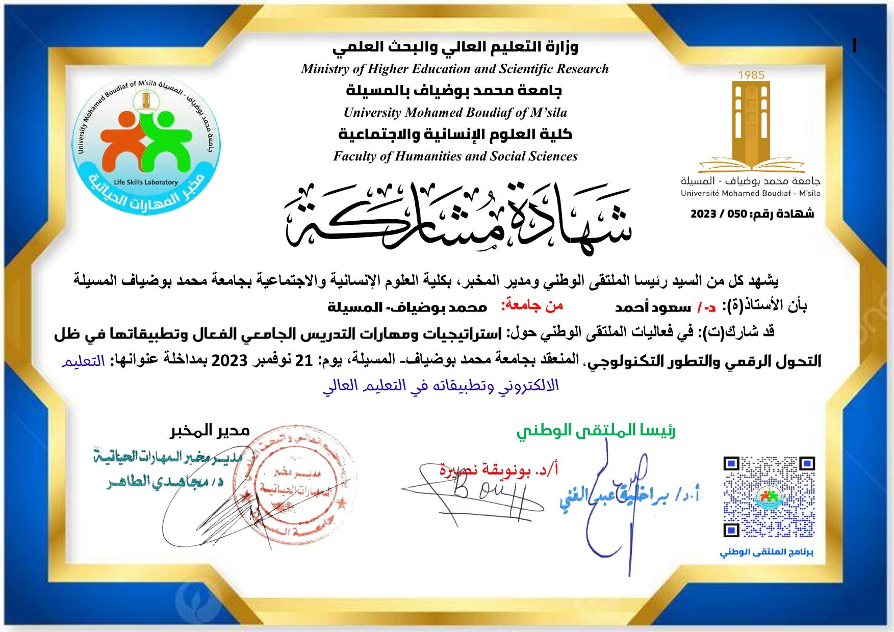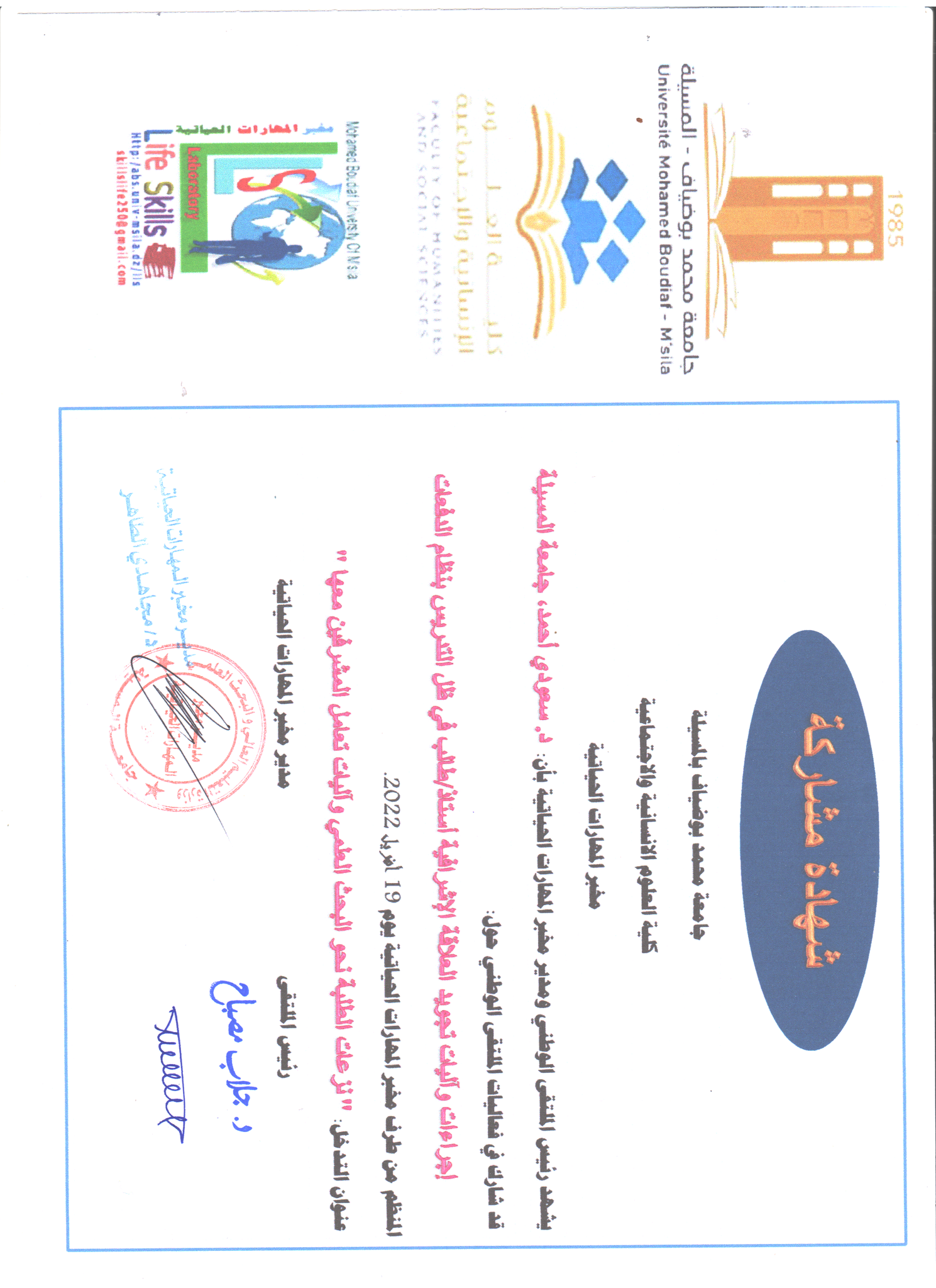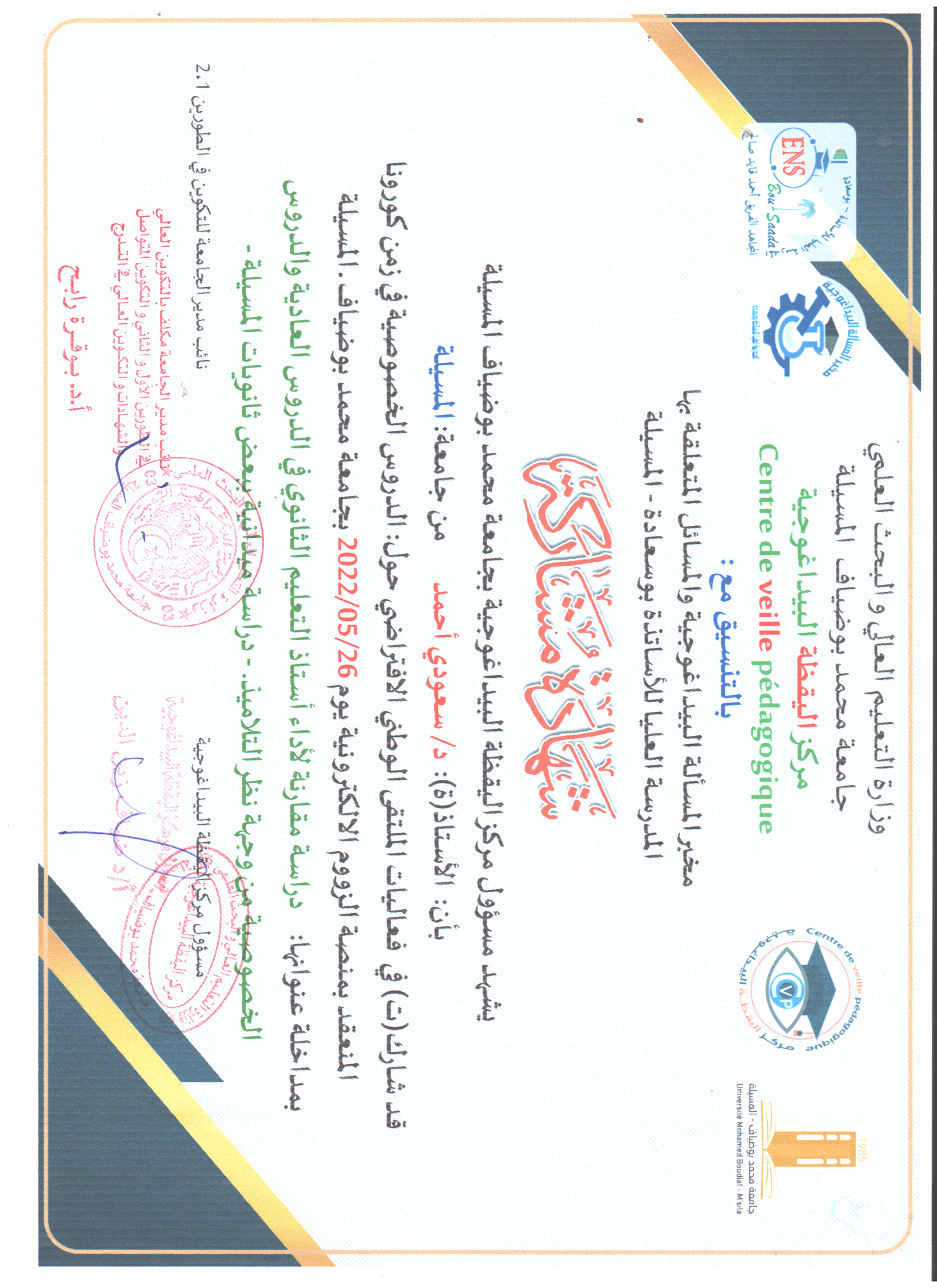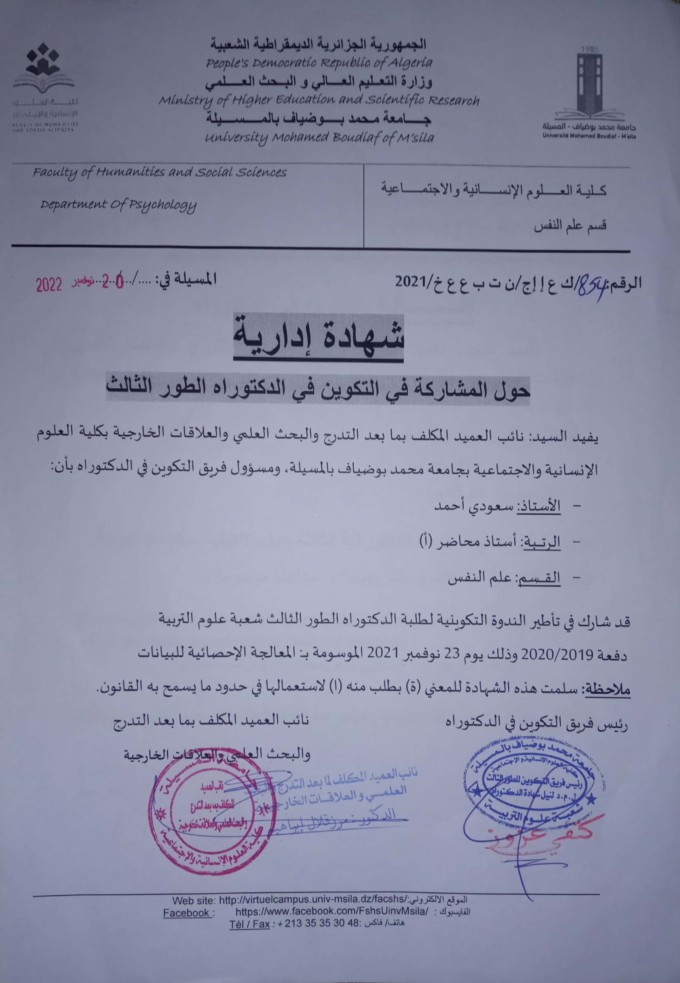 M. SAOUDI Ahmed, (2020-10-01), "المناخ العلمي بين األستاذ والطالب في الجامعة الجزائرية البحث العلمي، األخالق، المرافقة", [national] , مركز اليقظة البيداغوجية /جامعة المسيلة