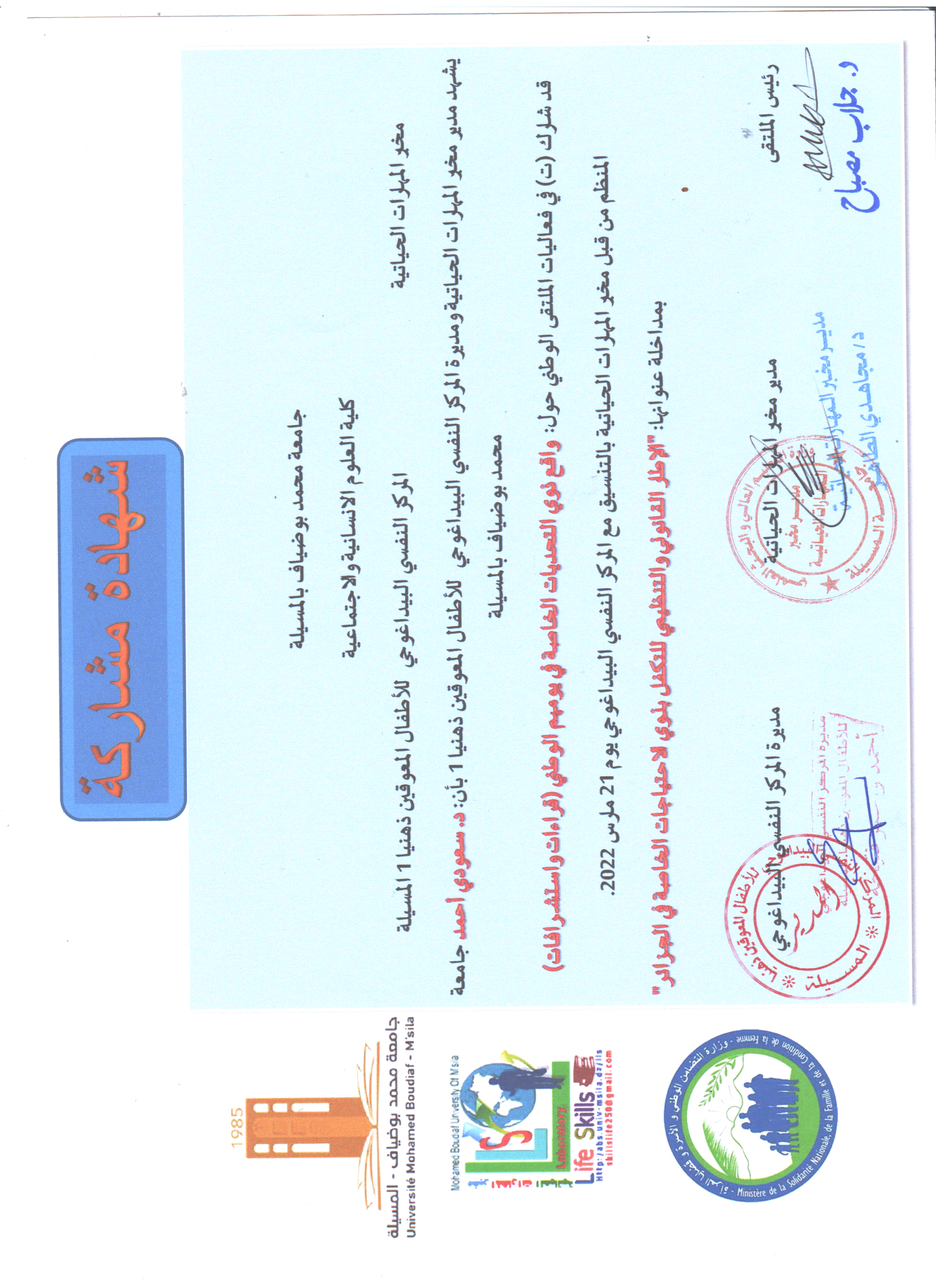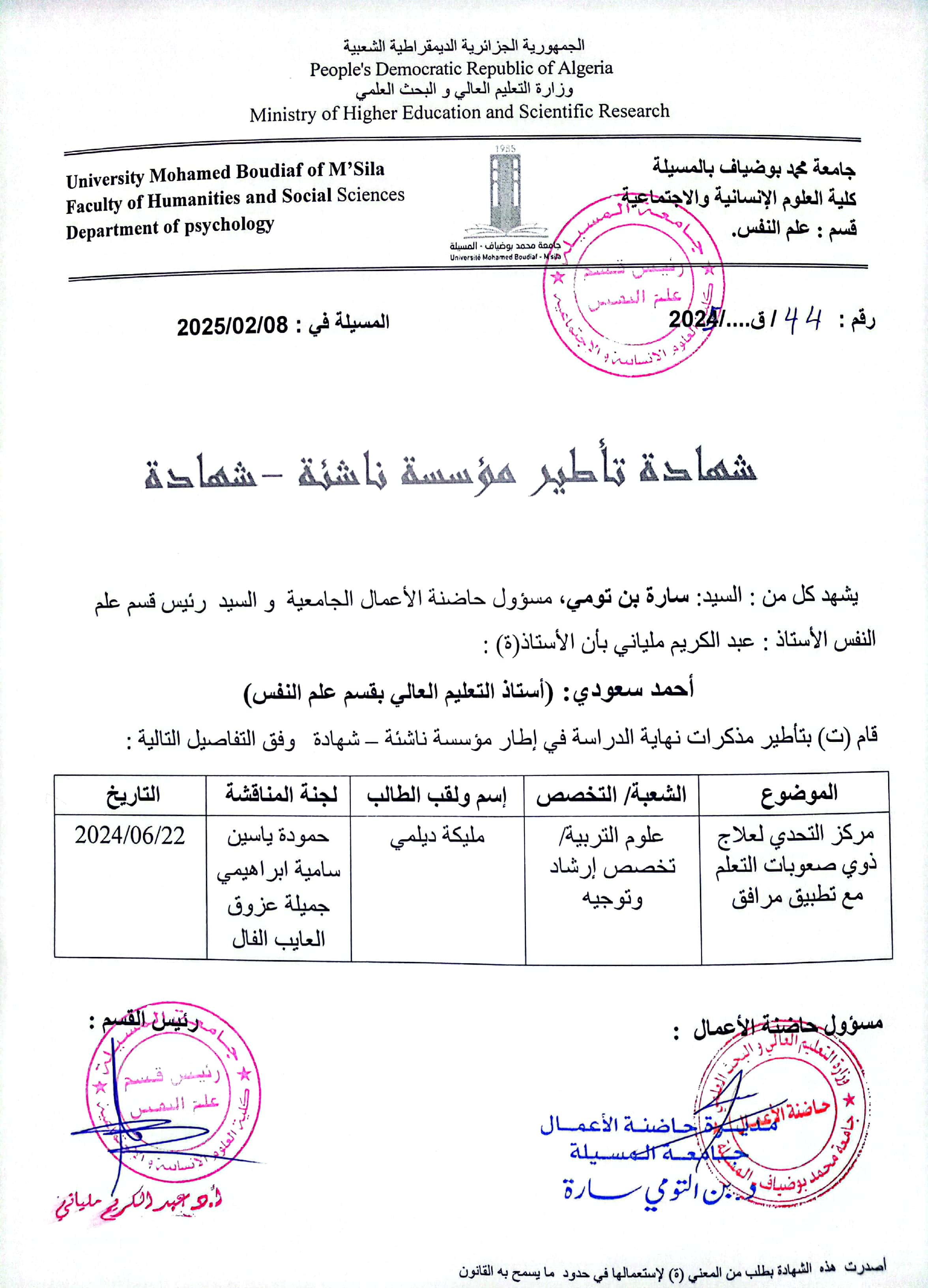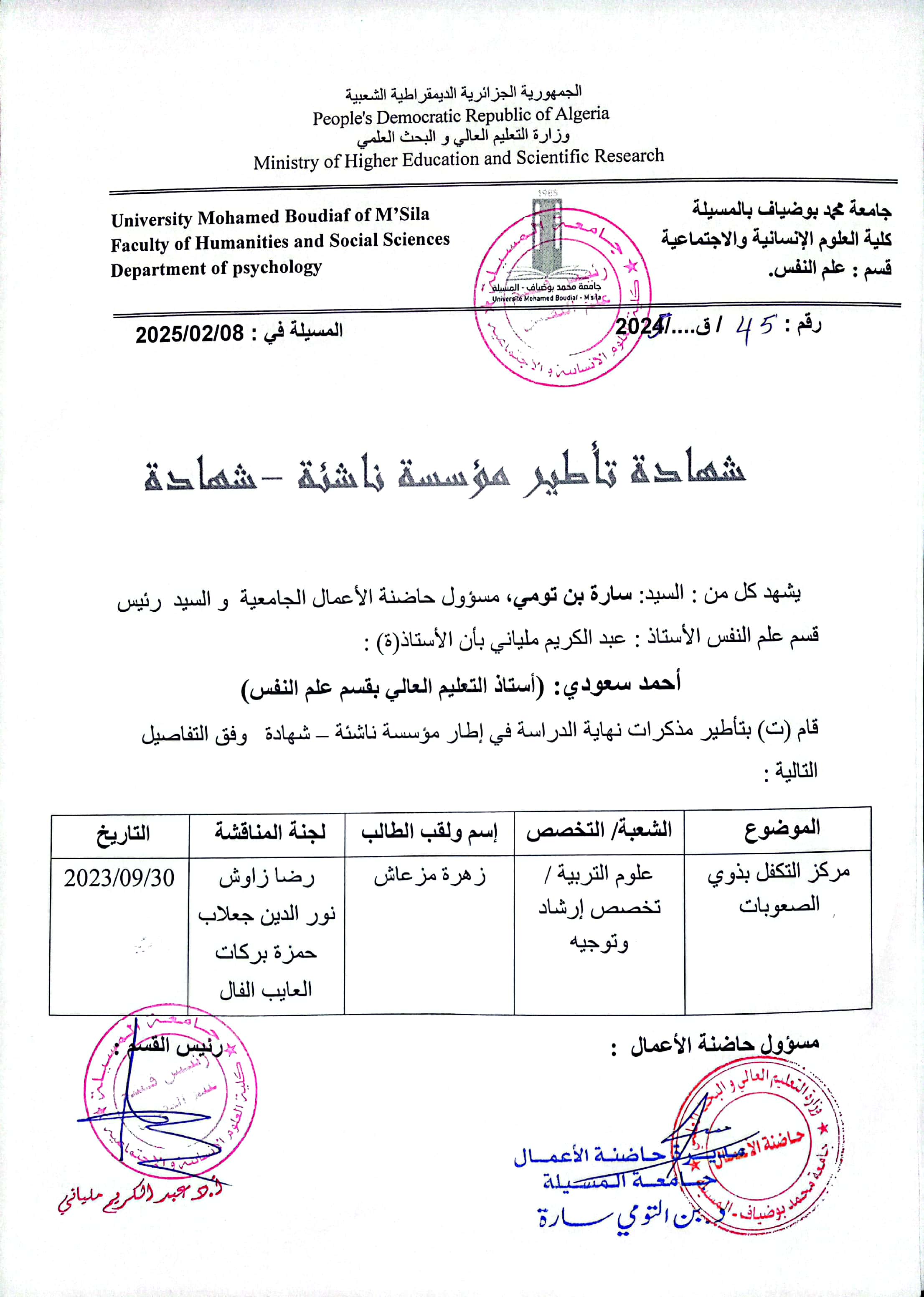 M. SAOUDI Ahmed, (2023-09-30), "مركز التكفل بذوي الصعوبات", [national] جامعة المسيلة