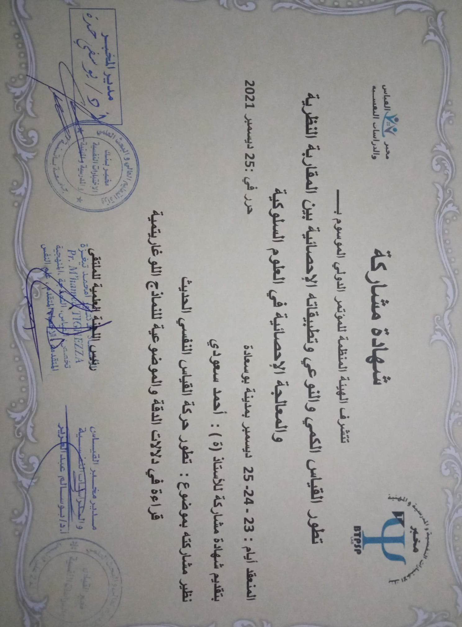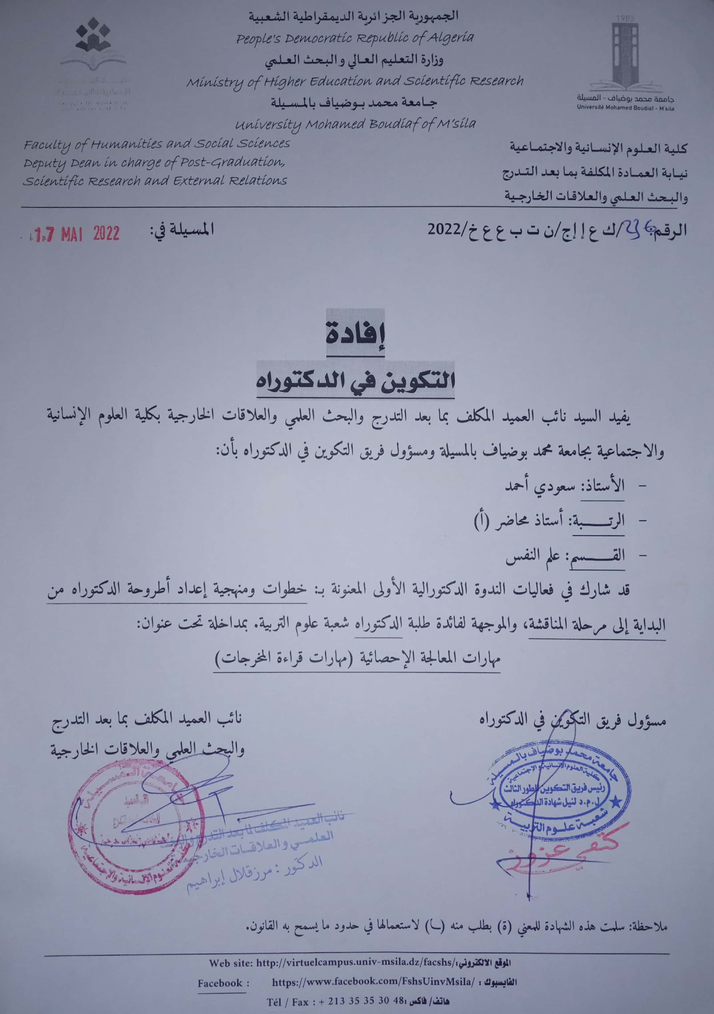 M. SAOUDI Ahmed, (2022), "المعالجة الإحصائية للبيانات", [national] الندوة التكوينية لطلبة الدكتوراه الطور الثالث شعبة علوم التربية دفعة 2019/2020 , جامعة المسيلة