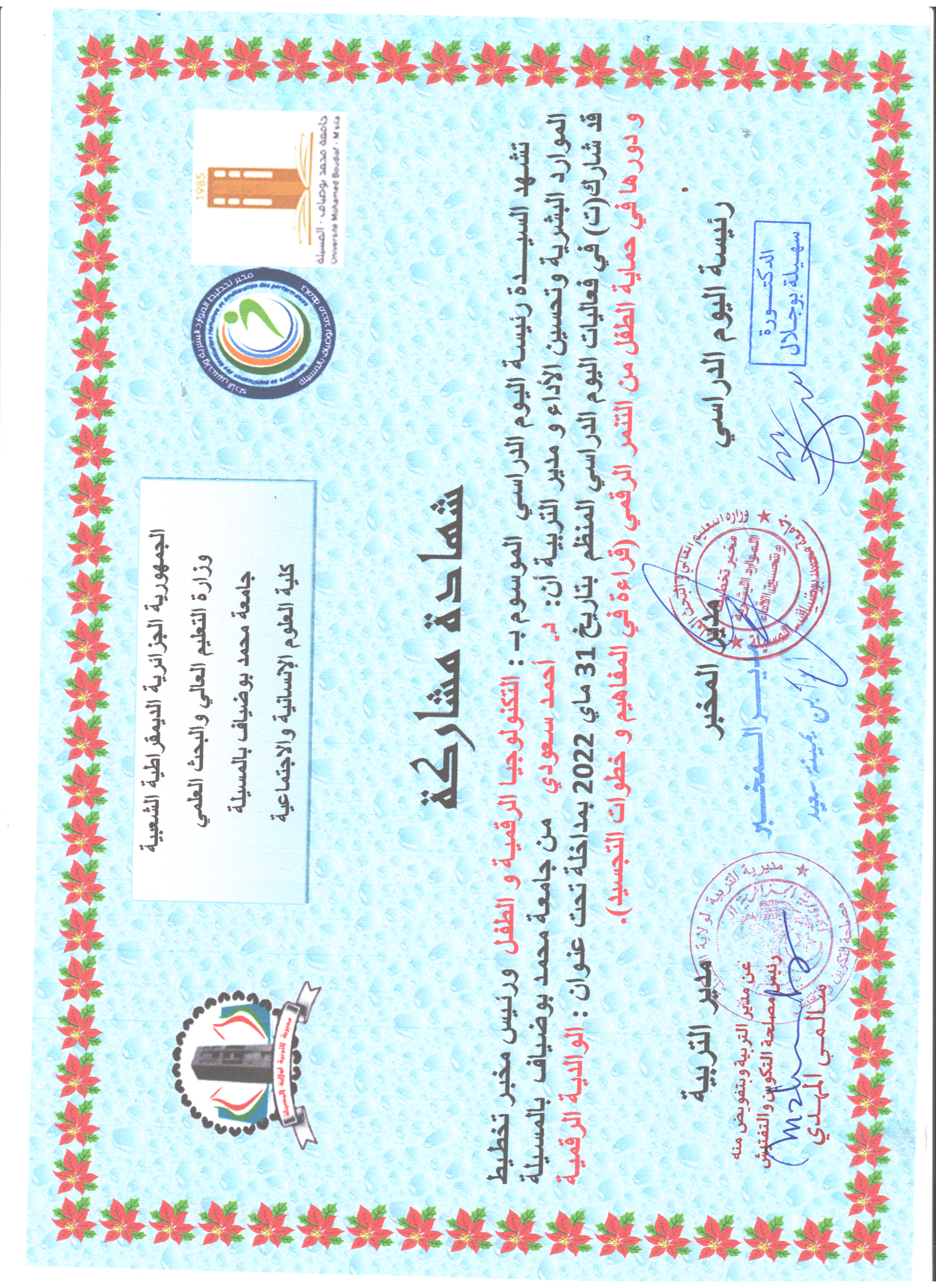 M. SAOUDI Ahmed, (2022), "التكنولوجيا الرقمية والطفل (ندوة وطنية)", [national] الوالدية الرقمية ودورها في حماية الطفل من التنمر الرقمي (قراءة في المفاهيم وخطوات التجسيد) , جامعة المسيلة