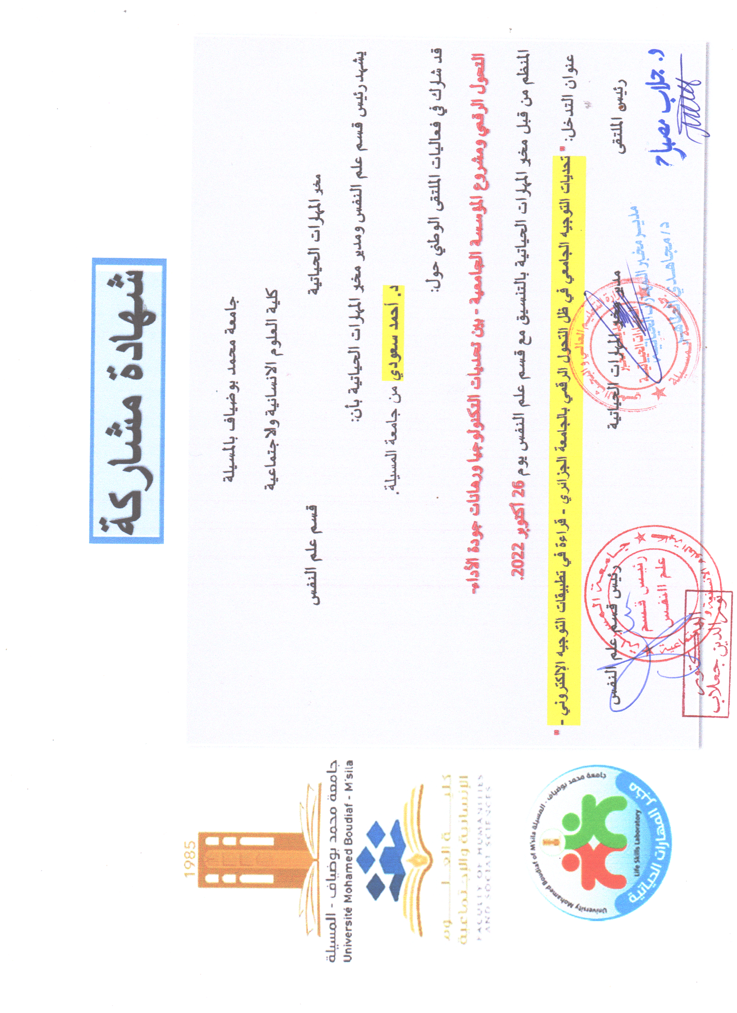 M. SAOUDI Ahmed, (2022), "تحديات التوجيه الجامعي في ظل التحول الرقمي بالجامعة الجزائرية -قراءة في تطبيقات التوجيه الالكتروني-", [national] التحول الرقمي ومشروع المؤسسة الجامعية -بين تحديات التكنولوجيا ورهانات جودة الأداء- , مخبر المهارات الحياتية، جامعة المسيلة