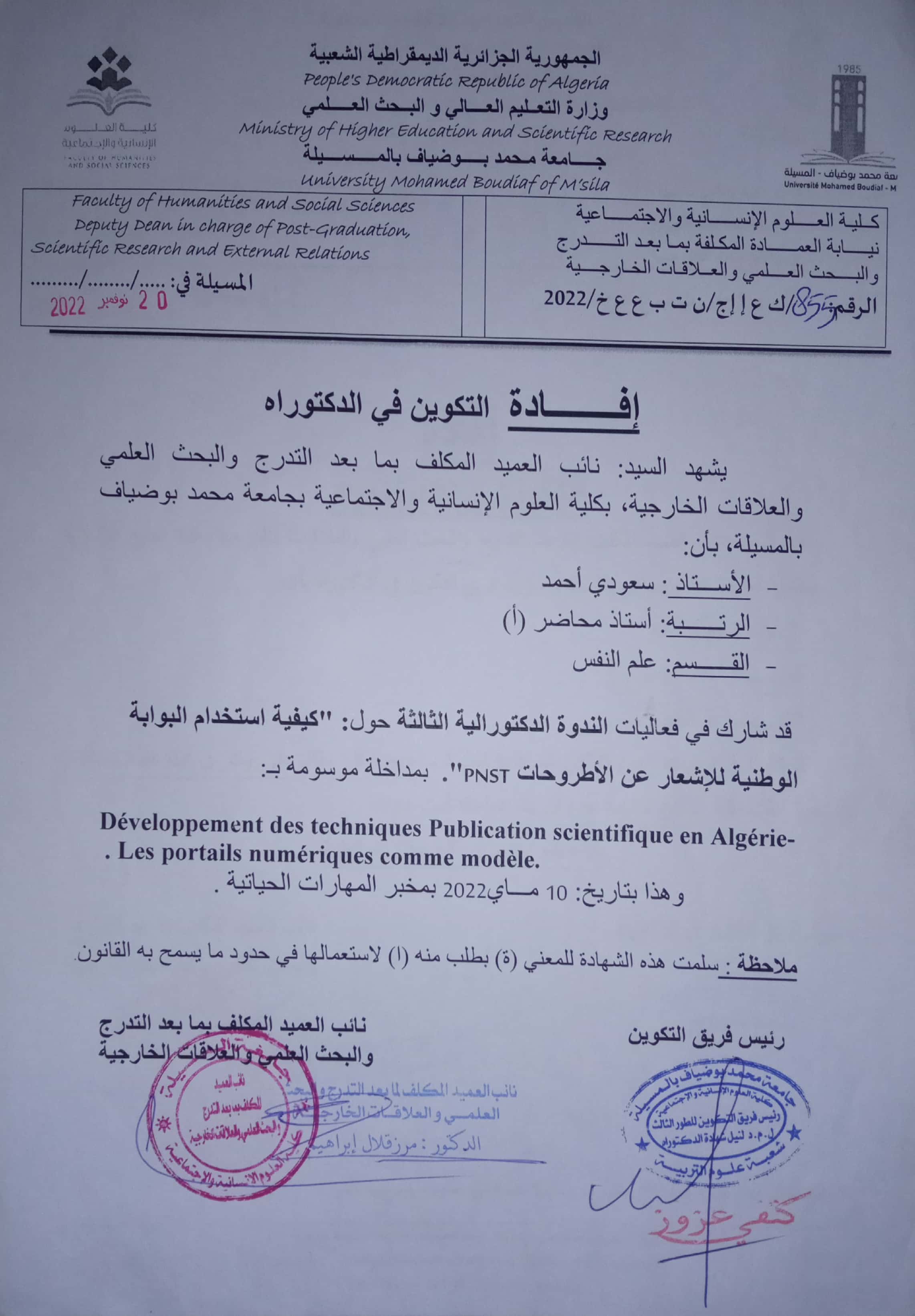 M. SAOUDI Ahmed, (2022), "Développement des techniques Publication scientifique en Algérie. -Les portails numériques comme modèle", [national] الندوة الدكتورالية الثالثة حول كيفية استخدام البوابة الوطنية للإشعار عن الأطروحات PNST , جامعة المسيلة